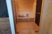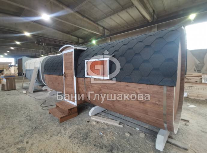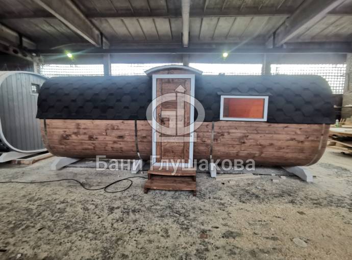 Баня изготовлена из еловой бочковой доски с лунным пазом. Снаружи покрашена на 2 слоя защитным составом Акватекс. Крыша покрыта надёжной гибкой черепицей технониколь Шинглас.