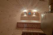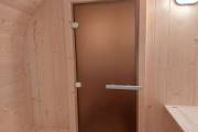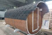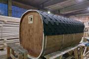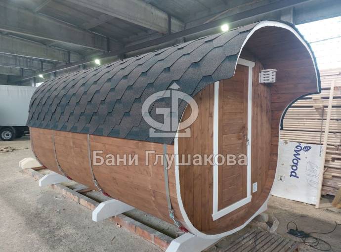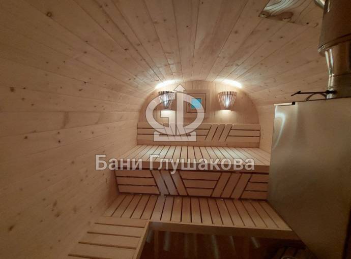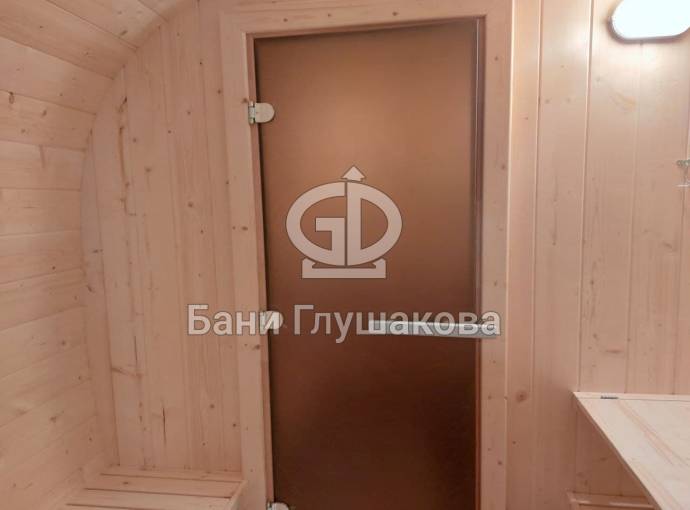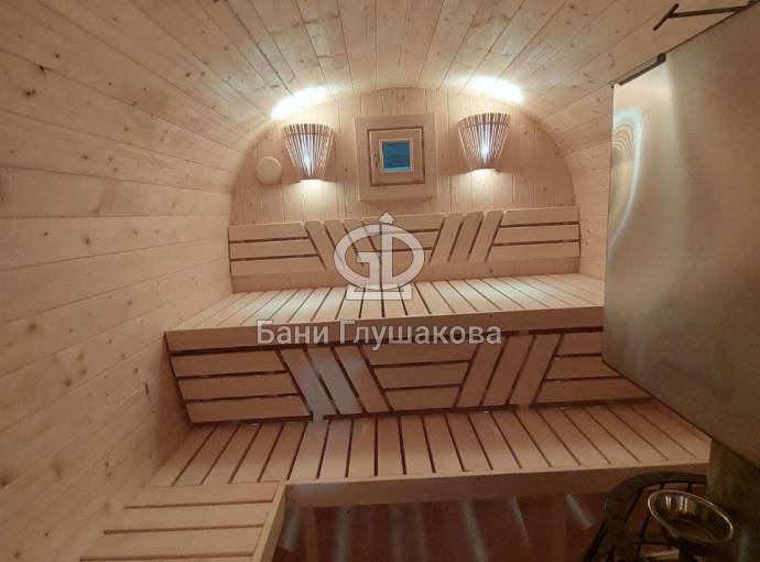 Это стандартный вариант на 2 помещения: предбанник и парная. В стоимость уже входит сборка, модифицированная печь Бочонок Компакт с парогенератором, электрика, светильники, покраска (Акватекс «Орех»).