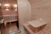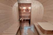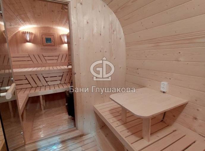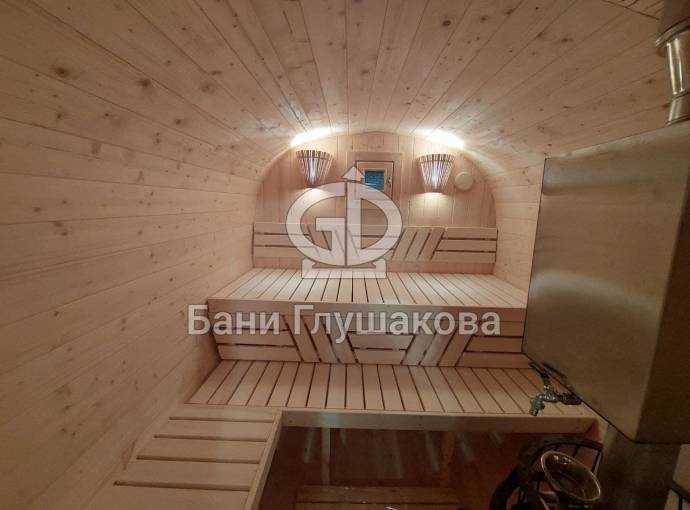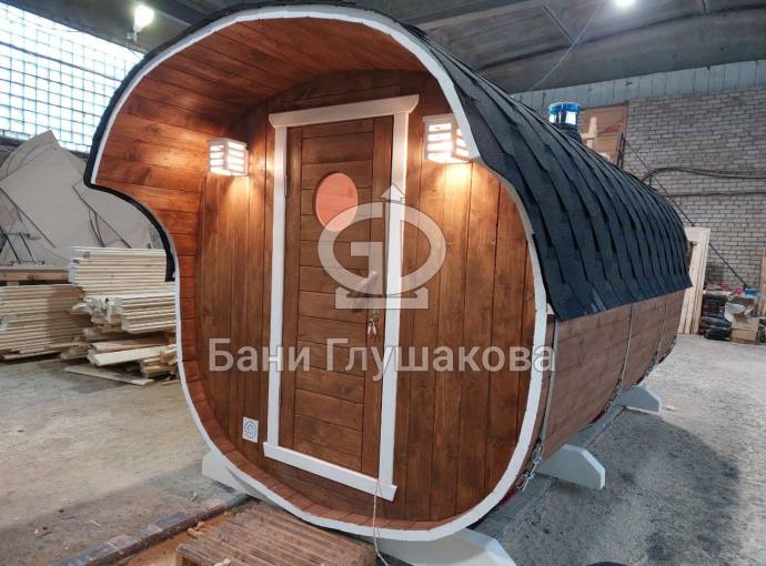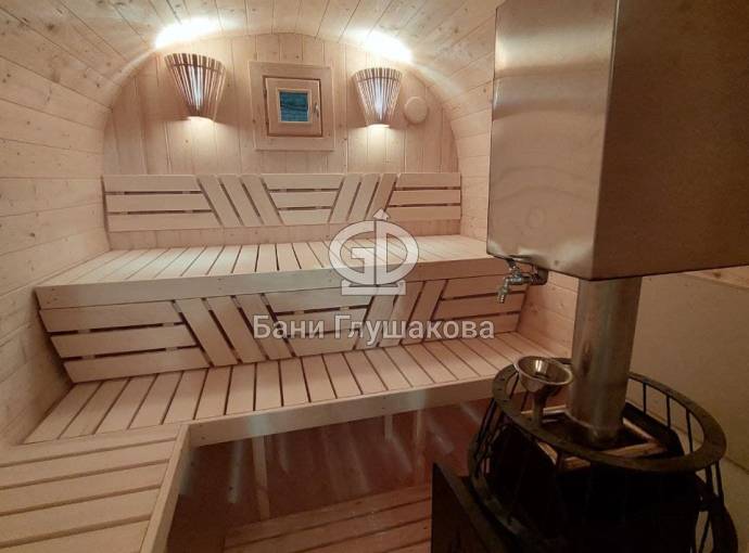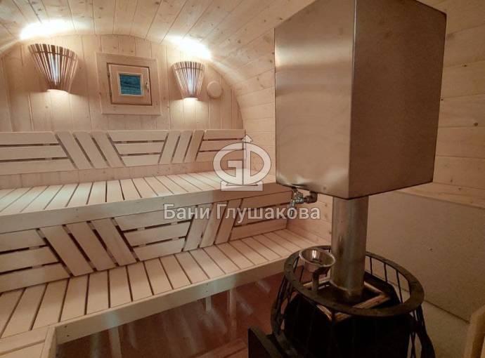 Это стандартный вариант на 2 помещения: предбанник и парная. В стоимость уже входит сборка, модифицированная печь Бочонок Компакт с парогенератором, электрика, светильники, покраска (Акватекс «Орех»).
