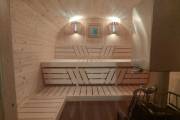 Замечательная расстановка в парной: широкие полки поставлены углом, а печь сбоку. Поверьте нашему многолетнему опыту — это и правда самый удобный вариант.