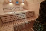 Замечательная расстановка в парной: широкие полки поставлены углом, а печь сбоку. Поверьте нашему многолетнему опыту — это и правда самый удобный вариант.