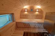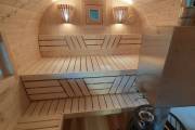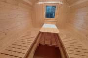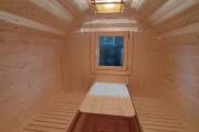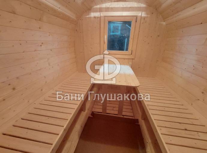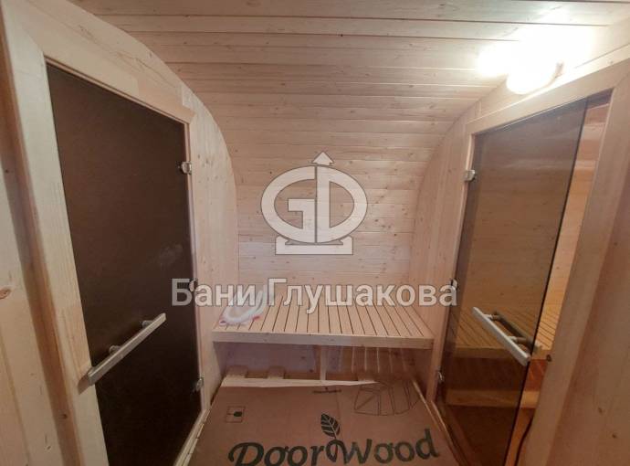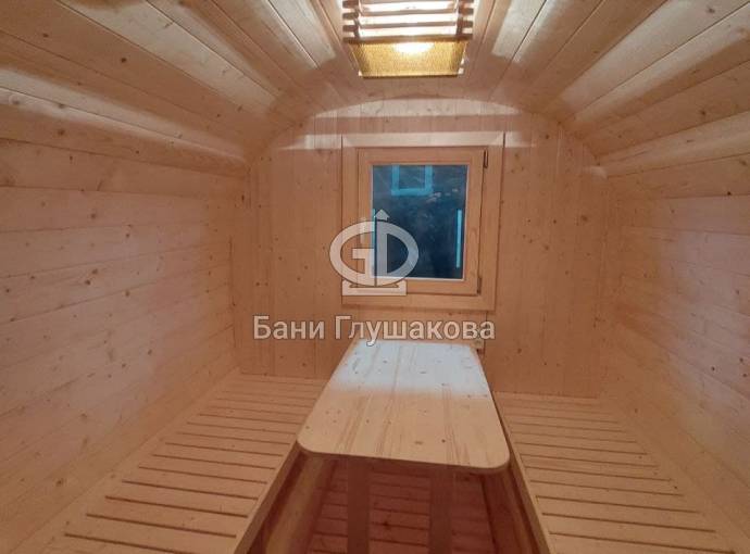 Это квадробочка из ели с улучшенной планировкой. Вход располагается по центру и украшен аккуратной аркой-козырьком. Внутри есть предбанник, сауна и комната отдыха. Обратите внимание, что это модель не оснащена душевой системой — мыться в парной, там для этого всё подготовлено.