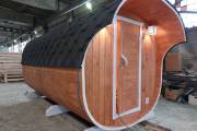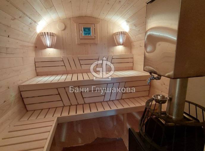 Это стандартный вариант на 2 помещения: предбанник и парная. В стоимость уже входит сборка, модифицированная печь Бочонок Компакт с парогенератором, электрика, светильники, покраска (Акватекс).