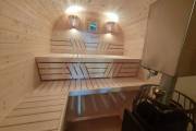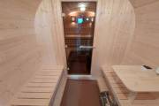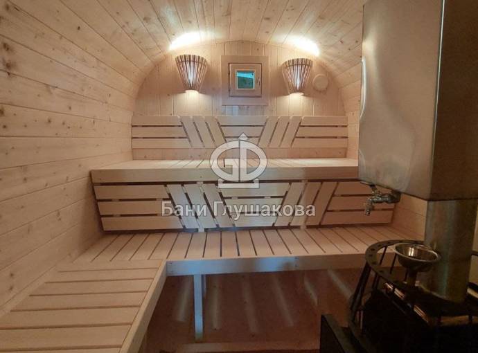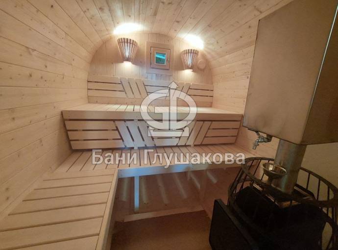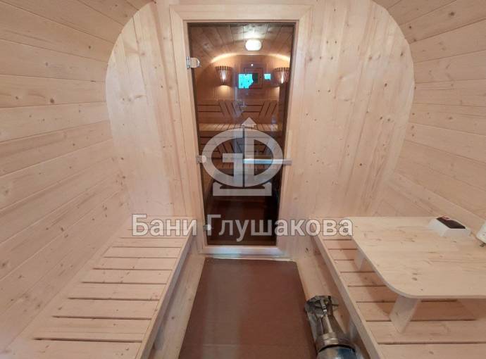 Это стандартный вариант на 2 помещения: предбанник и парная. В стоимость уже входит сборка, модифицированная печь Бочонок Компакт с парогенератором, электрика, светильники, покраска (Акватекс).