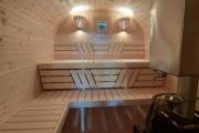 Замечательная расстановка в парной: широкие полки поставлены углом, а печь сбоку. Поверьте нашему многолетнему опыту — это и правда самый удобный вариант.