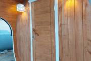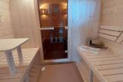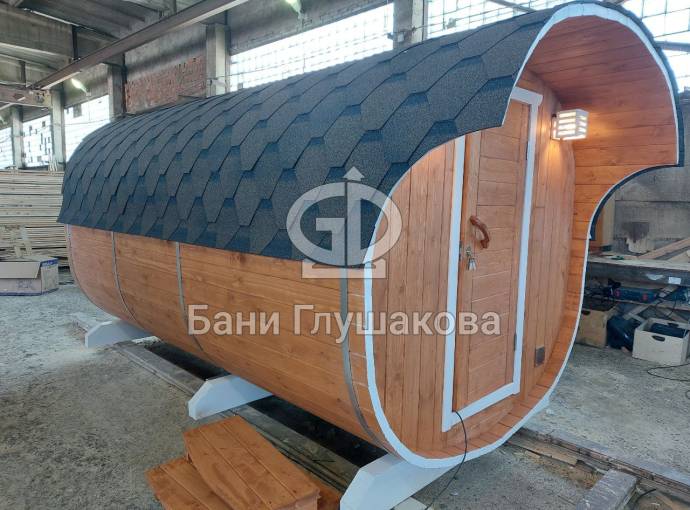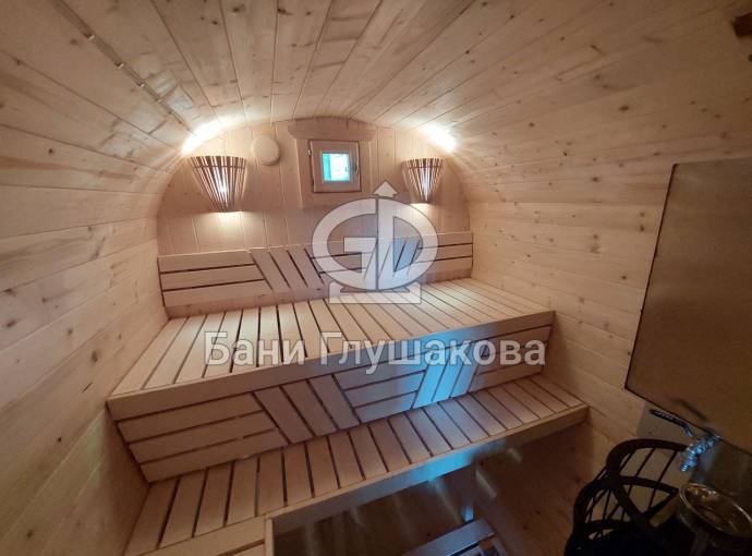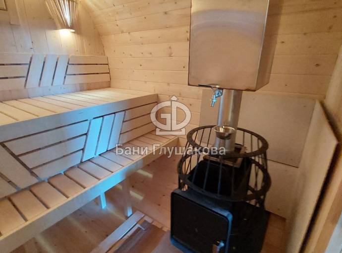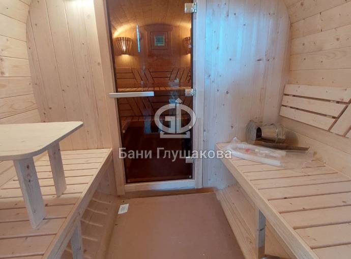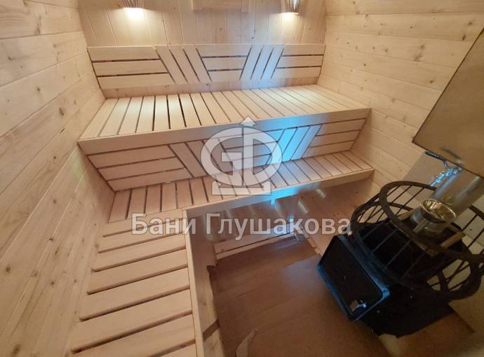 Это стандартный вариант на 2 помещения: предбанник и парная. В стоимость уже входит сборка, модифицированная печь Бочонок Компакт с парогенератором, электрика, светильники, покраска (Акватекс).