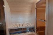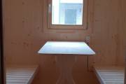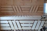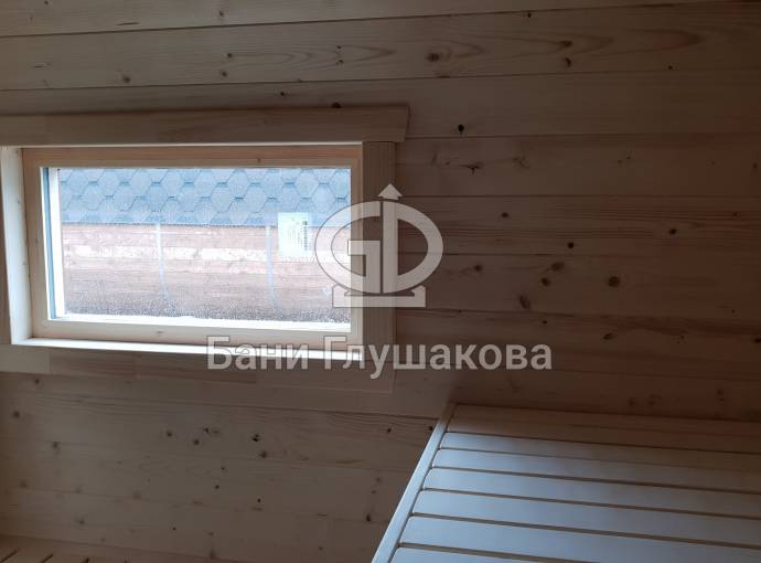 Это квадробочка из ели с улучшенной планировкой. Вход располагается по центру и украшен аккуратной аркой-козырьком. Внутри есть предбанник, сауна и комната отдыха. Обратите внимание, что это модель не оснащена душевой системой — мыться в парной, там для этого всё подготовлено.