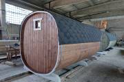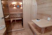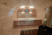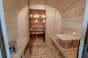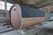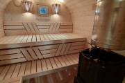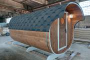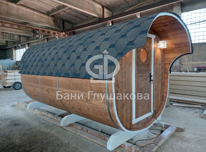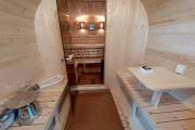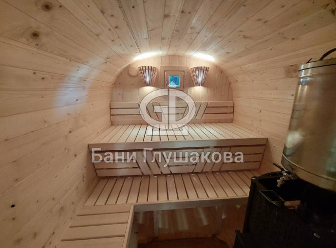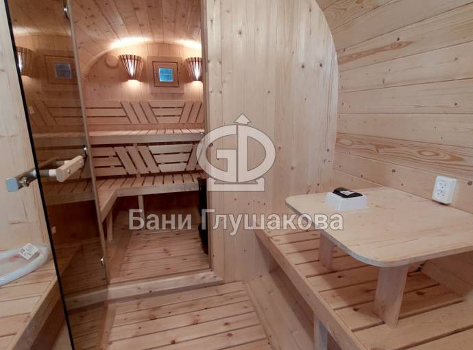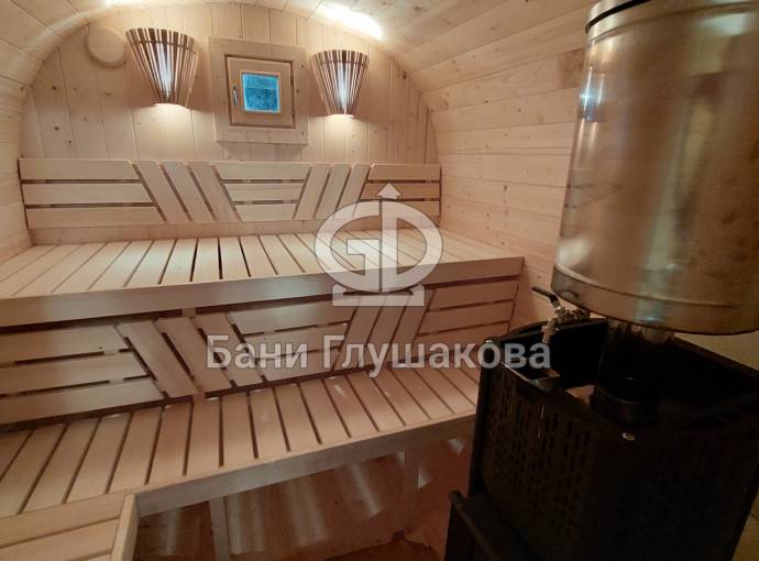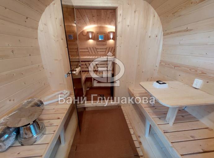 Это стандартный вариант на 2 помещения: предбанник и парная. В стоимость уже входит сборка, модифицированная печь Костёр Rain с парогенератором, электрика, светильники, ступеньки, покраска «Орех» (Акватекс).