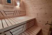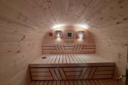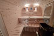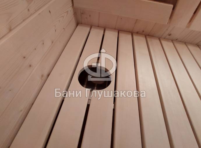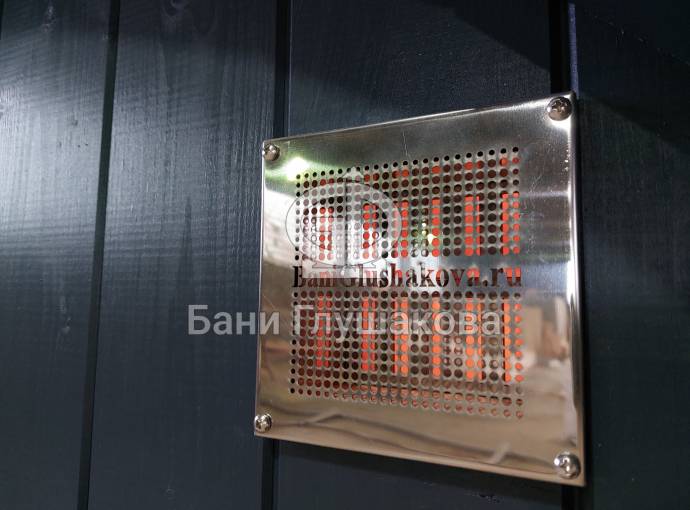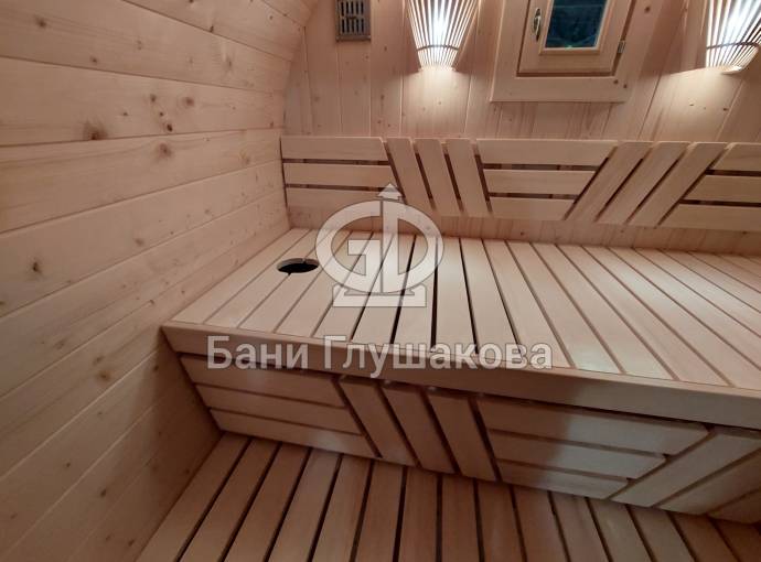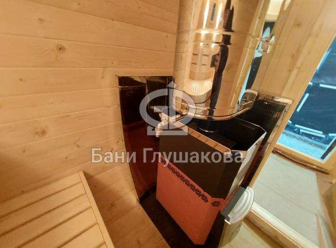 Это стандартный вариант на 2 помещения: предбанник и парная. В стоимость уже входит сборка, печь Теплодар Русь 12 ЛУ, электрика, светильники, ступеньки. Вокруг печи стоит металлический экран. Устновлены металлические вентиляционные клапаны-задвижки.