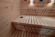 Замечательная расстановка в парной: широкие полки поставлены углом, а печь сбоку. Поверьте нашему многолетнему опыту — это и правда самый удобный вариант.
