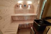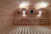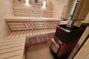 Замечательная расстановка в парной: широкие полки поставлены углом, а печь сбоку. Поверьте нашему многолетнему опыту — это и правда самый удобный вариант.