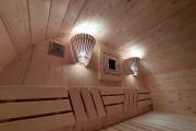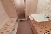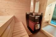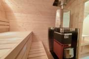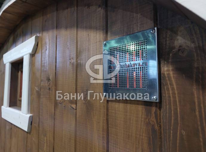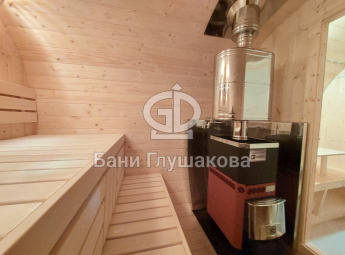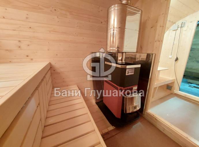 Это стандартный вариант на 2 помещения: предбанник и парная. В стоимость уже входит сборка, печь Теплодар Русь 12 ЛУ, электрика, светильники, ступеньки. Вокруг печи стоит металлический экран. Устновлены металлические вентиляционные клапаны-задвижки.