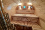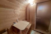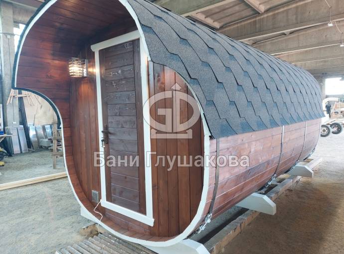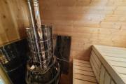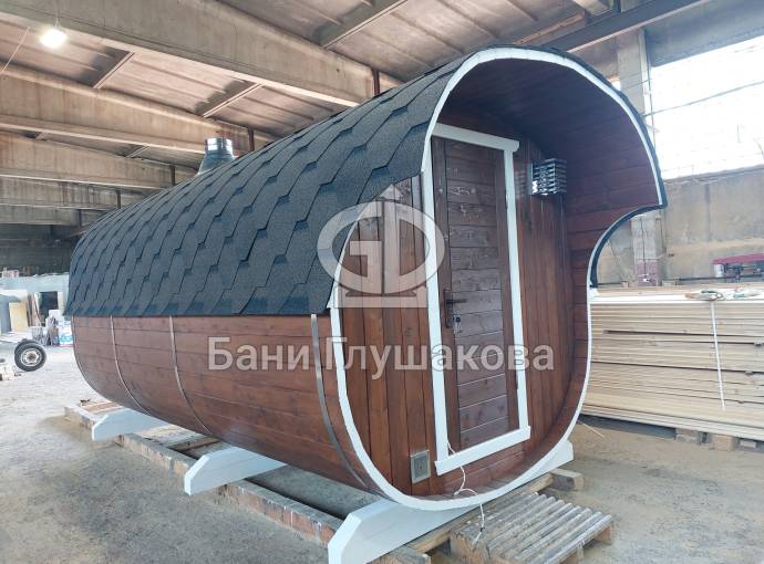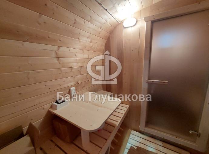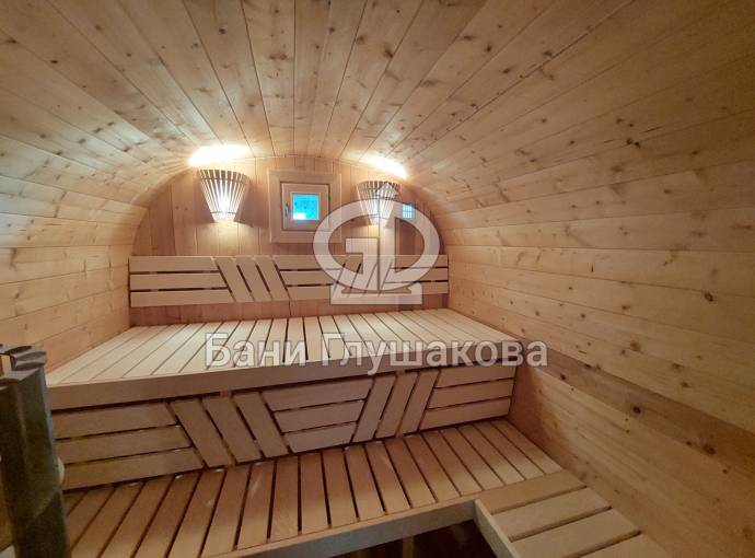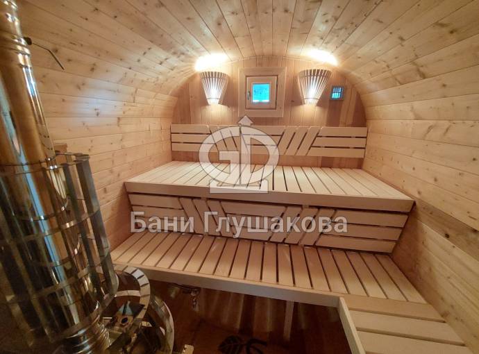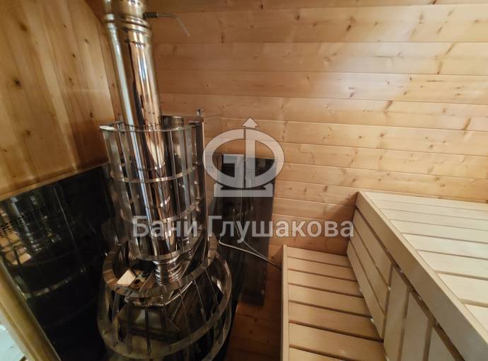 Это стандартный вариант на 2 помещения: предбанник и парная. В стоимость уже входит сборка, печь нашего производства с двумя каменками и парогенератором, электрика, металлические уличные светильники, ступеньки. Вокруг печи стоит металлический экран. Установлены металлические вентиляционные клапаны-задвижки. Ступеньки тоже уже входят в стоимость.