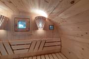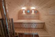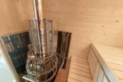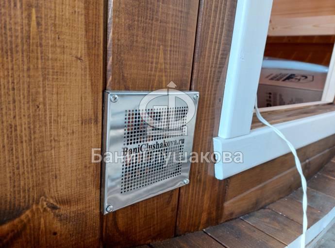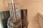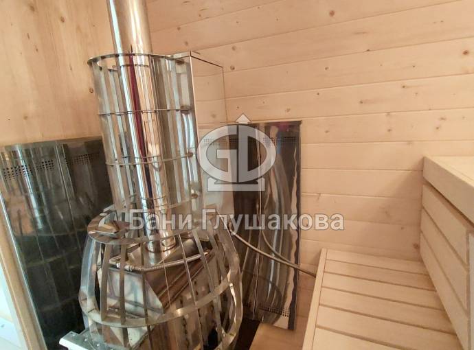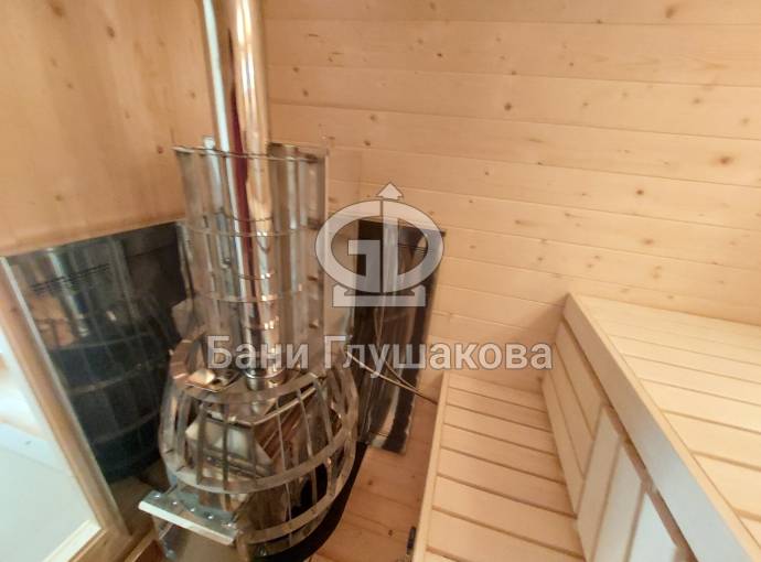 Это стандартный вариант на 2 помещения: предбанник и парная. В стоимость уже входит сборка, печь нашего производства с двумя каменками и парогенератором, электрика, металлические уличные светильники, ступеньки. Вокруг печи стоит металлический экран. Установлены металлические вентиляционные клапаны-задвижки. Ступеньки тоже уже входят в стоимость.