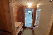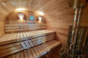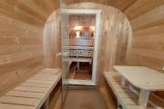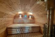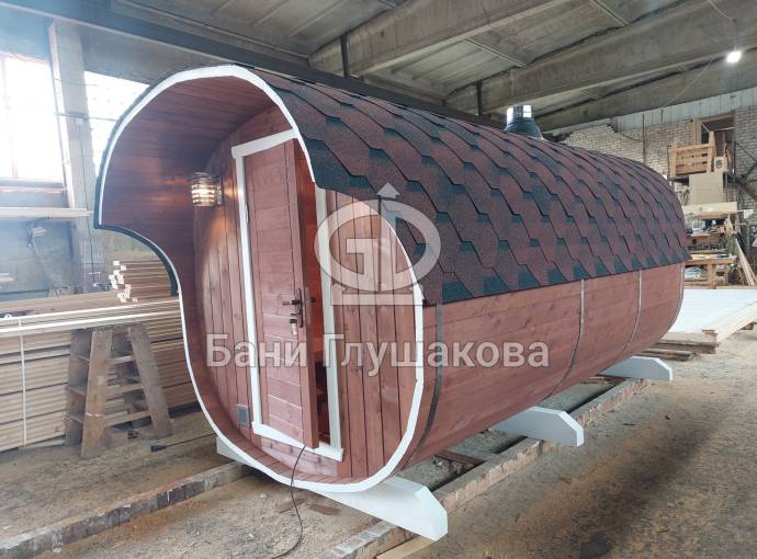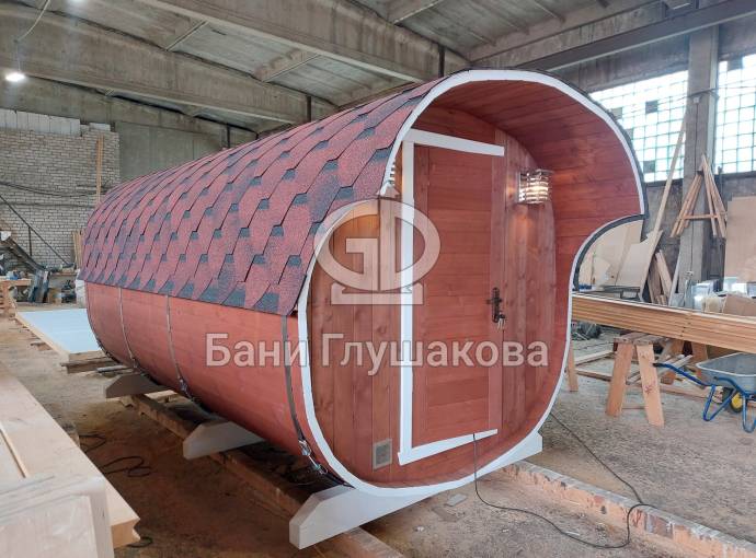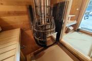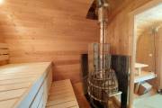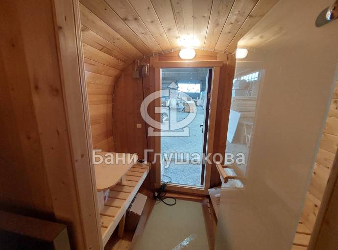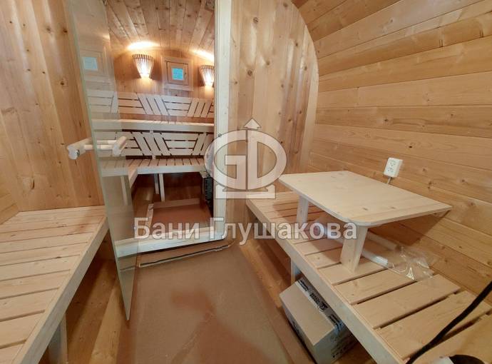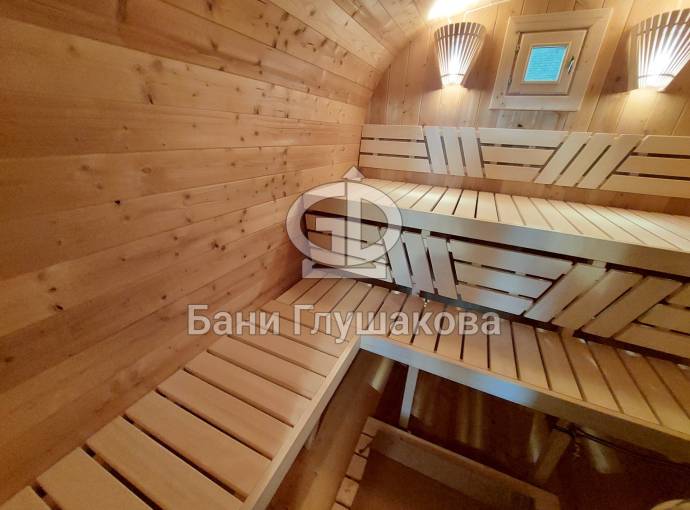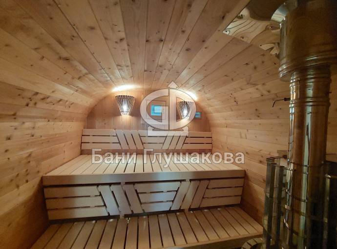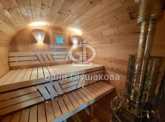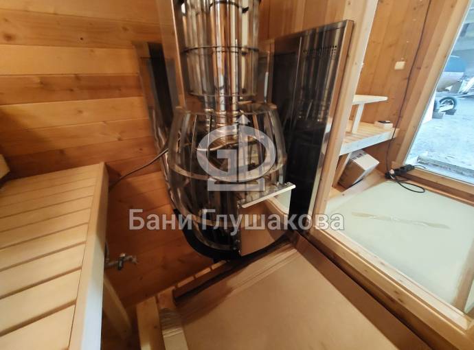 Это стандартный вариант на 2 помещения: предбанник и парная. В стоимость уже входит сборка, печь нашего производства с двумя каменками и парогенератором, электрика, металлические уличные светильники, ступеньки. Вокруг печи стоит металлический экран. Установлены металлические вентиляционные клапаны-задвижки. Ступеньки тоже уже входят в стоимость.