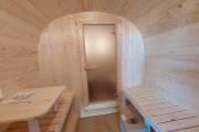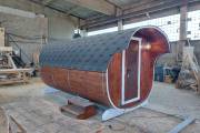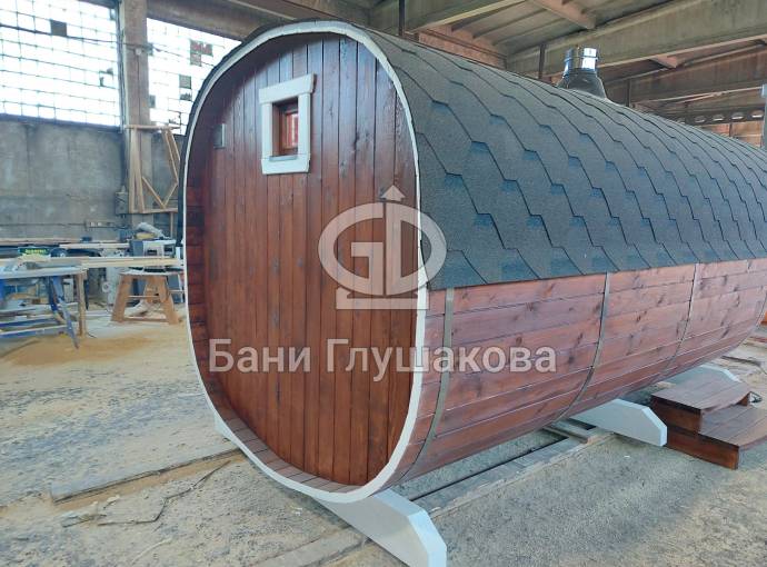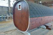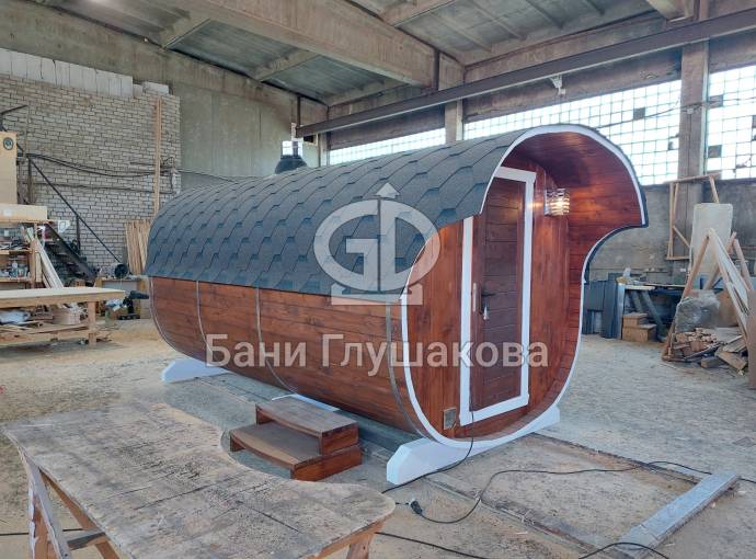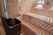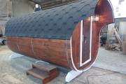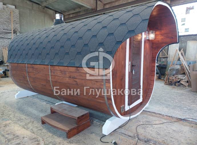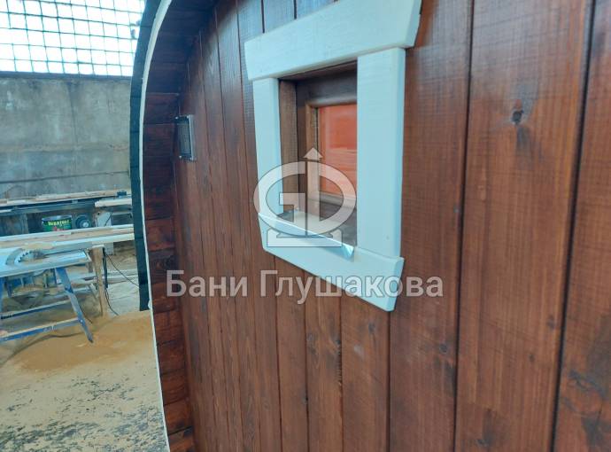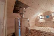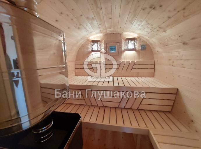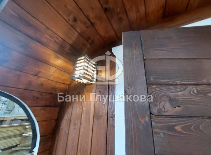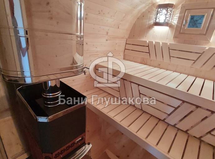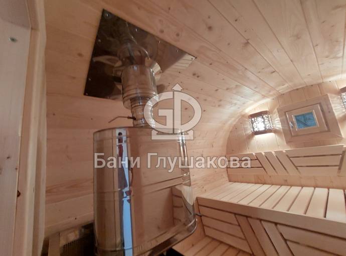 Это стандартный вариант на 2 помещения: предбанник и парная. В стоимость уже входит сборка, печь нашего производства с двумя каменками и парогенератором, электрика, металлические уличные светильники, ступеньки. Вокруг печи стоит металлический экран. Установлены металлические комплектующие из нержавейки: вентиляционные клапаны-задвижки, крепления для проводки, наличник на форточку и порожек между помещениями. Ступеньки тоже уже входят в стоимость.
