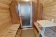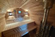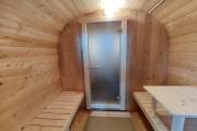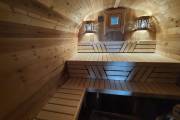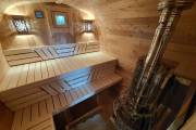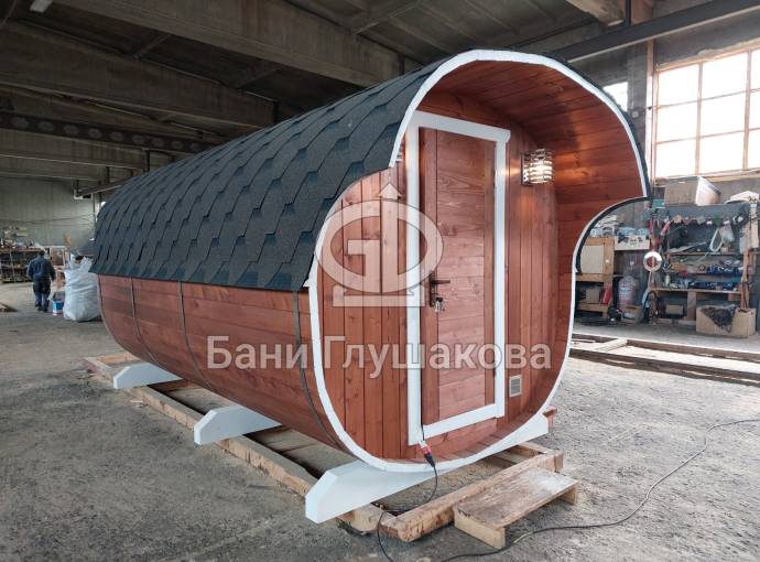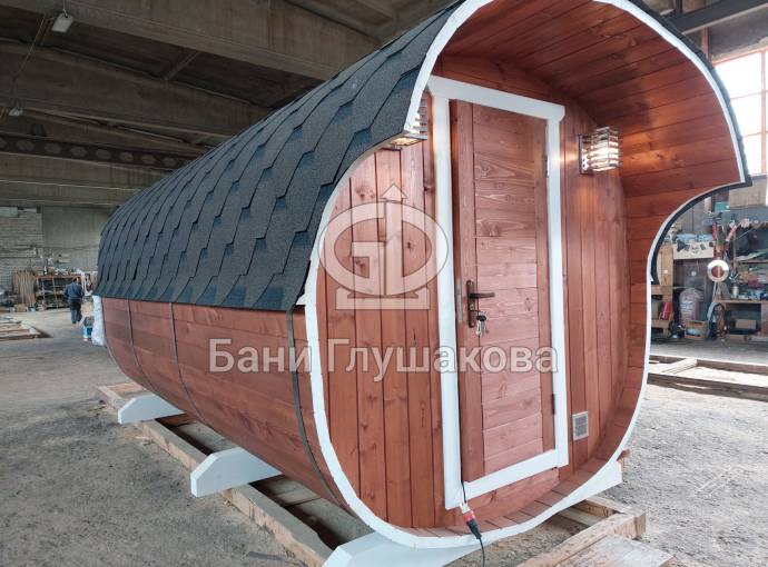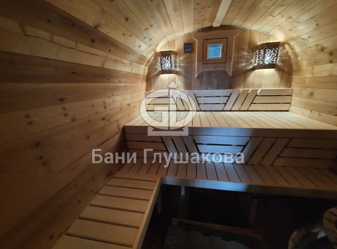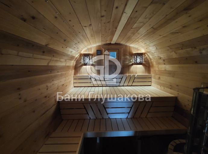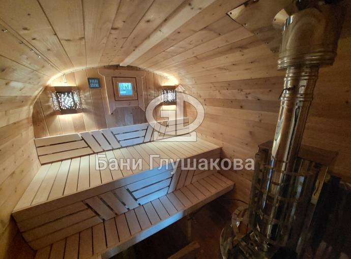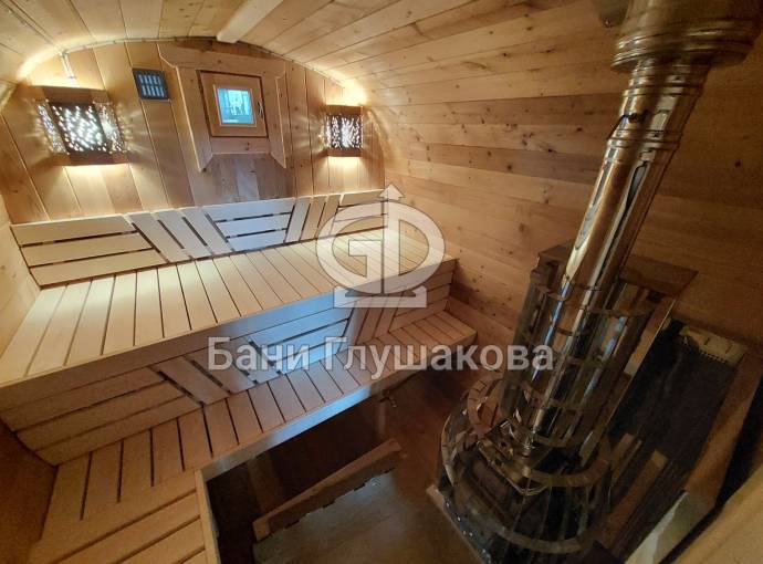 Это стандартный вариант на 2 помещения: предбанник и парная. В стоимость уже входит сборка, печь нашего производства с двумя каменками и парогенератором, электрика, металлические уличные светильники, ступеньки. Вокруг печи стоит металлический экран. Установлены металлические вентиляционные клапаны-задвижки. Ступеньки тоже уже входят в стоимость.