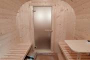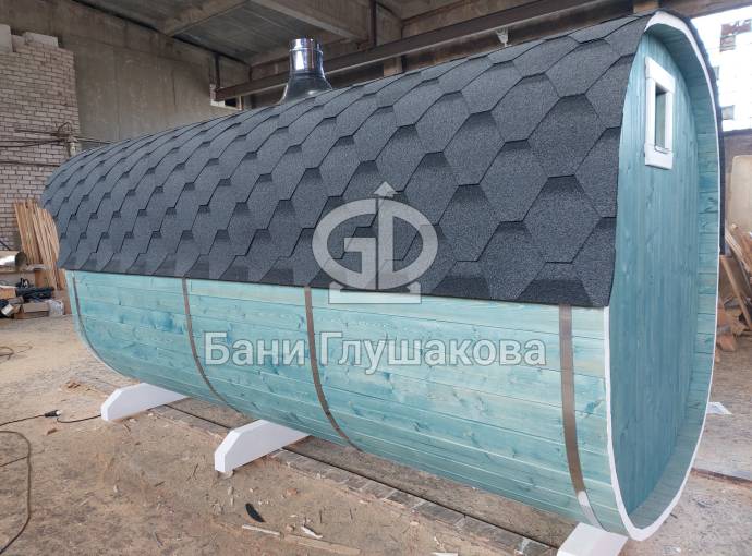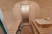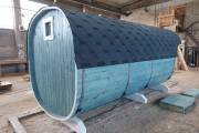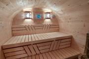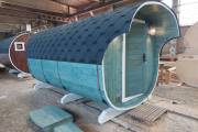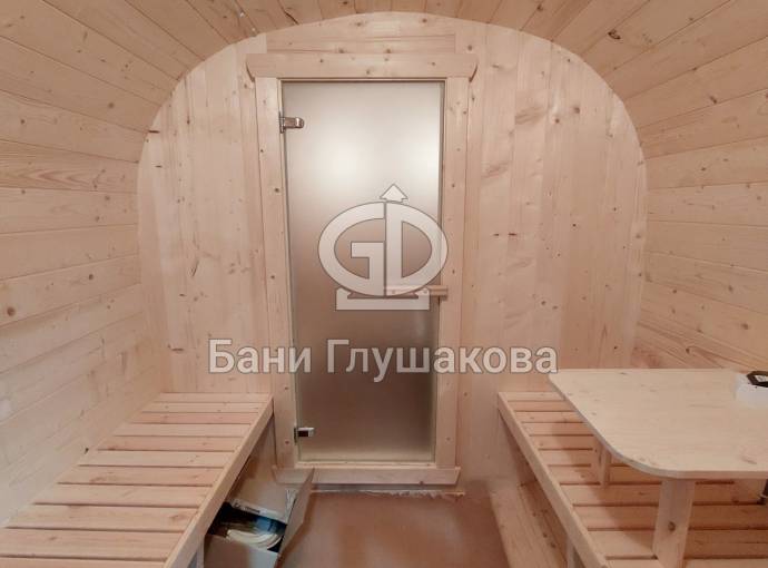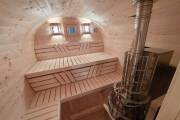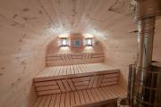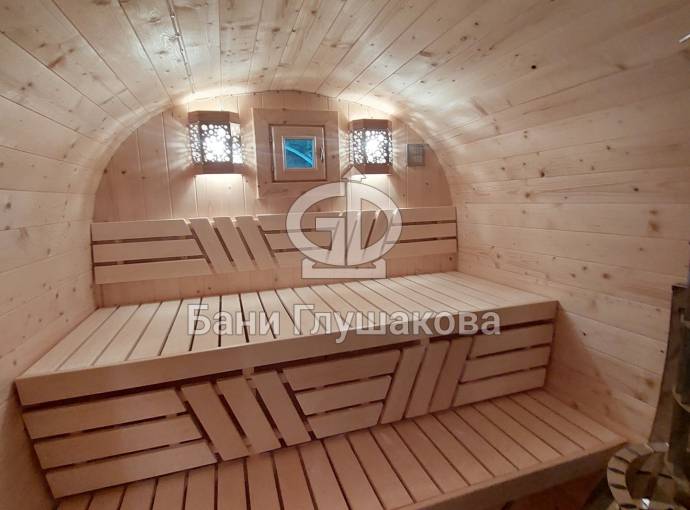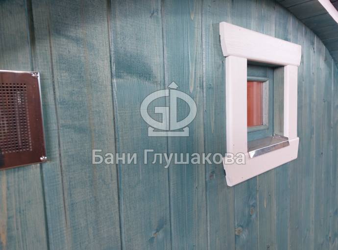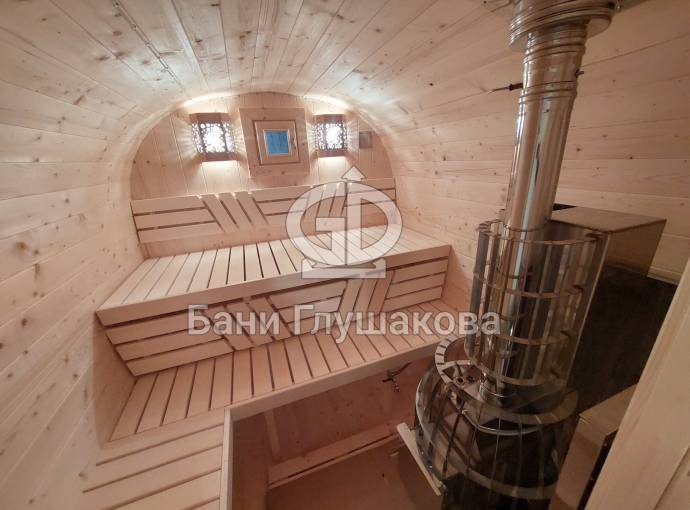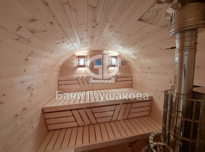 Это стандартный вариант на 2 помещения: предбанник и парная. В стоимость уже входит сборка, печь нашего производства с двумя каменками и парогенератором, электрика, металлические уличные светильники, ступеньки. Вокруг печи стоит металлический экран. Установлены металлические комплектующие из нержавейки: вентиляционные клапаны-задвижки, крепления для проводки, наличник на форточку и порожек между помещениями. Ступеньки тоже уже входят в стоимость.
