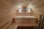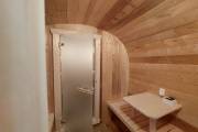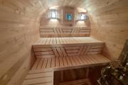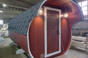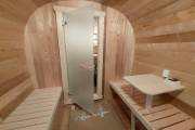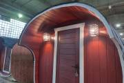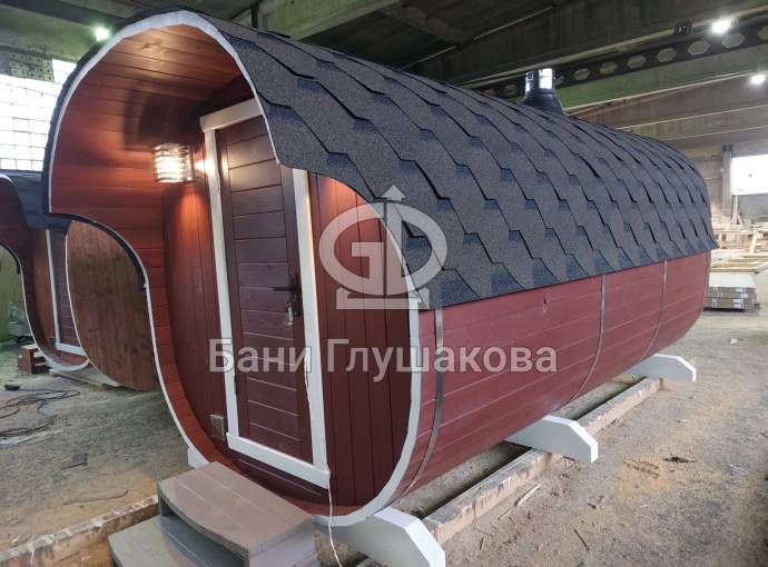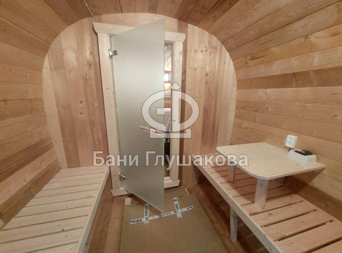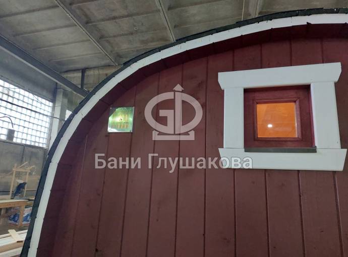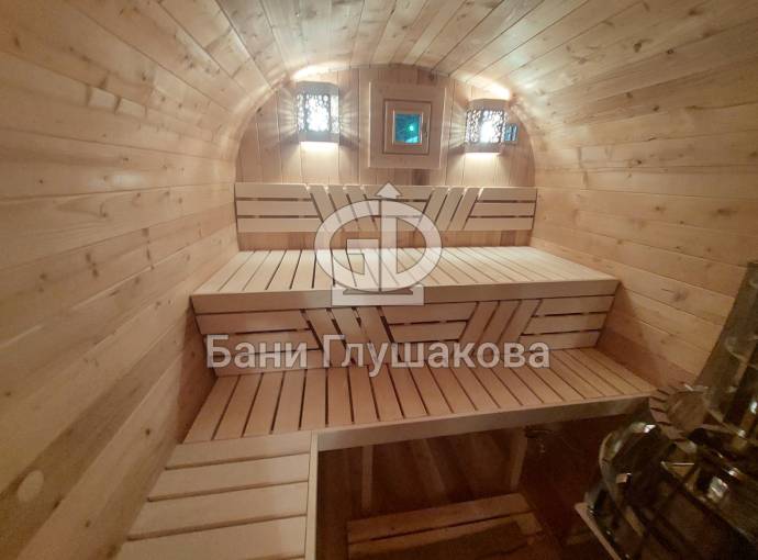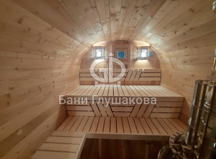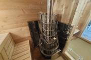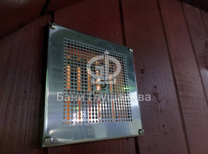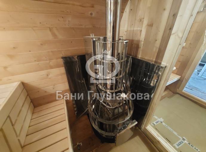Это стандартный вариант на 2 помещения: предбанник и парная. В стоимость уже входит сборка, печь нашего производства с двумя каменками и парогенератором, электрика, металлические уличные светильники, ступеньки. Вокруг печи стоит металлический экран. Установлены металлические комплектующие из нержавейки: вентиляционные клапаны-задвижки, крепления для проводки, наличник на форточку и порожек между помещениями. Ступеньки тоже уже входят в стоимость.