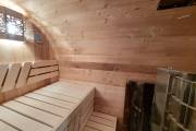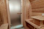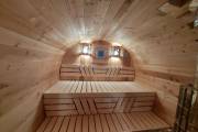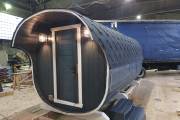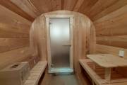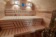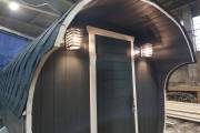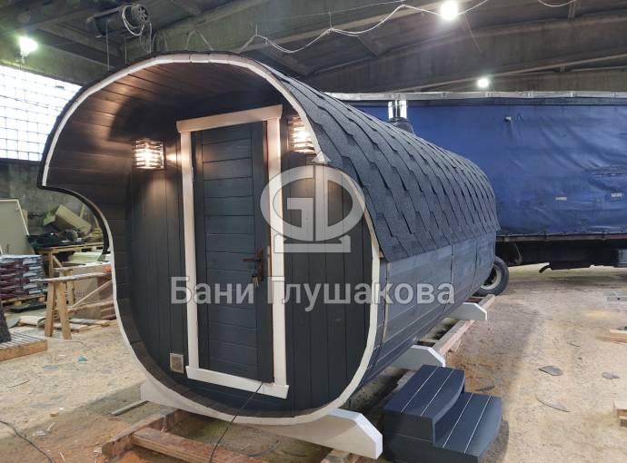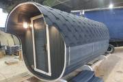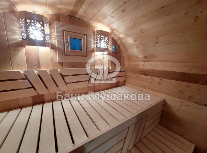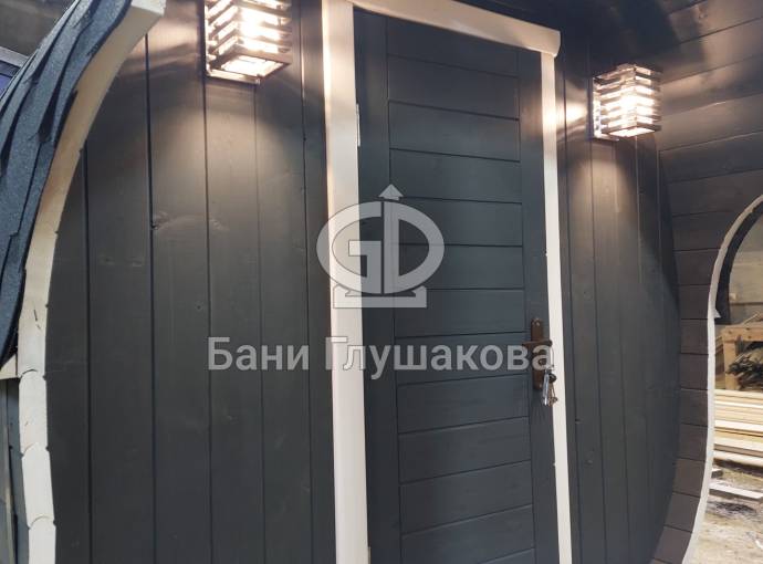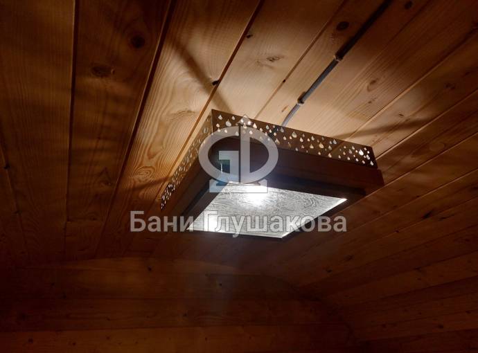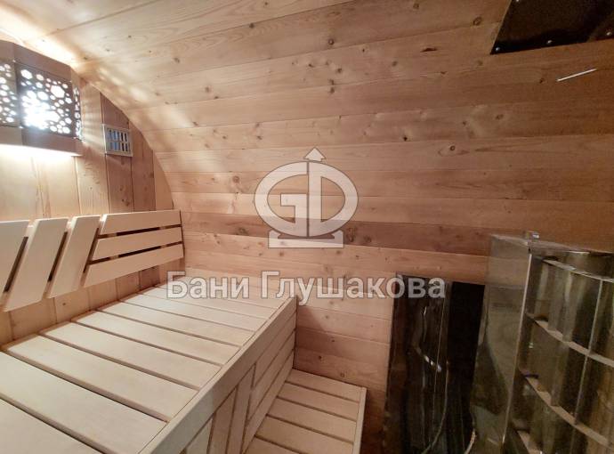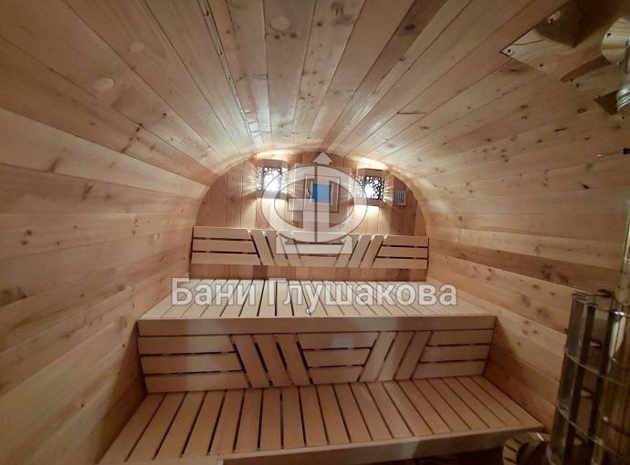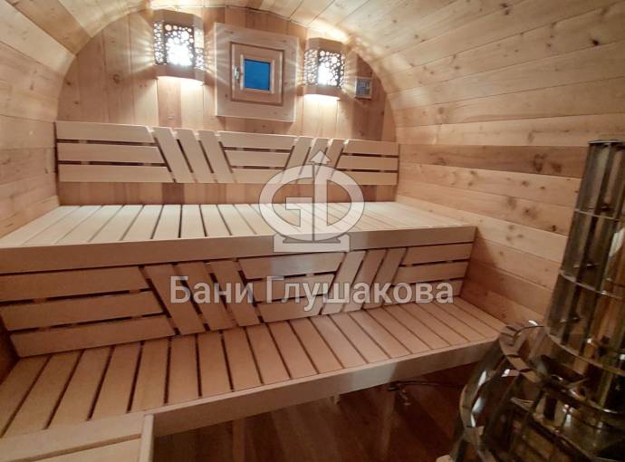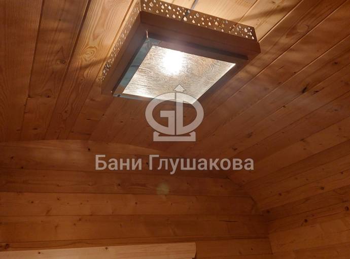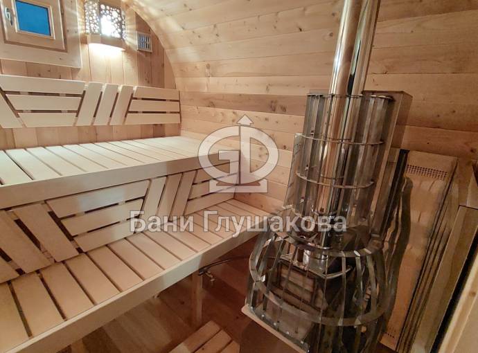 Это стандартный вариант на 2 помещения: предбанник и парная. В стоимость уже входит сборка, печь нашего производства с двумя каменками и парогенератором, электрика, металлические уличные светильники, ступеньки. Вокруг печи стоит металлический экран. Установлены металлические комплектующие из нержавейки: вентиляционные клапаны-задвижки, крепления для проводки, наличник на форточку и порожек между помещениями. Ступеньки тоже уже входят в стоимость.