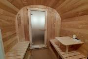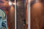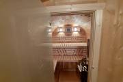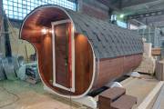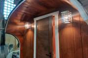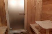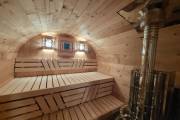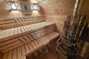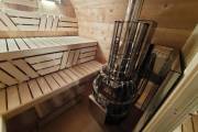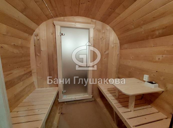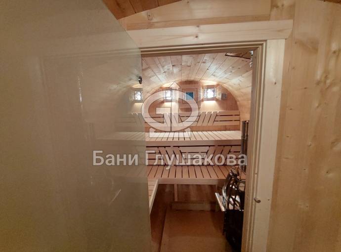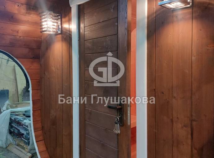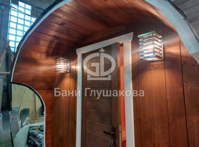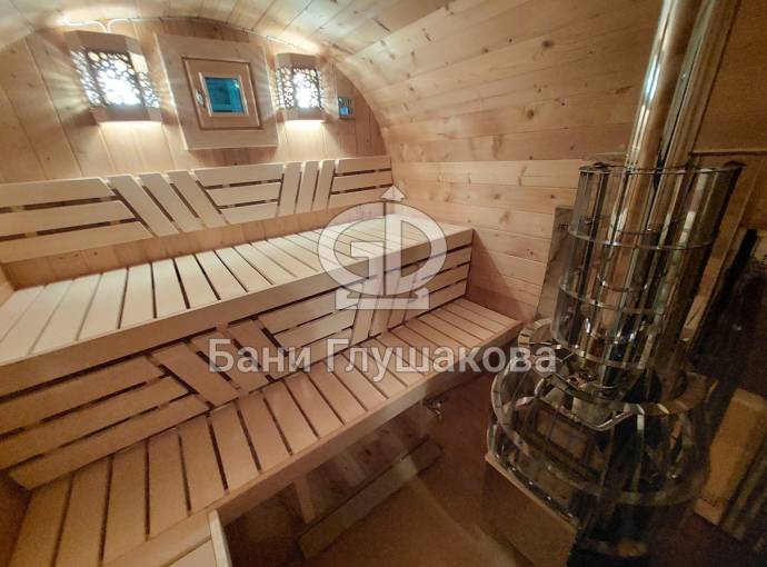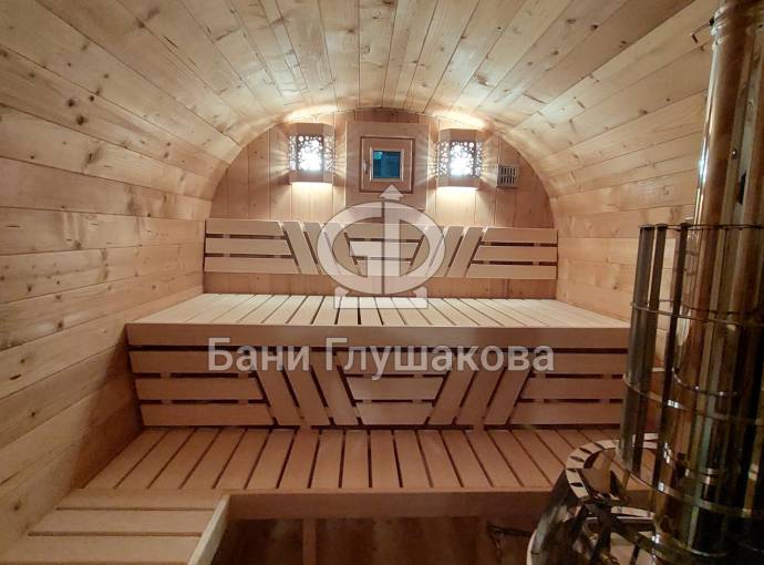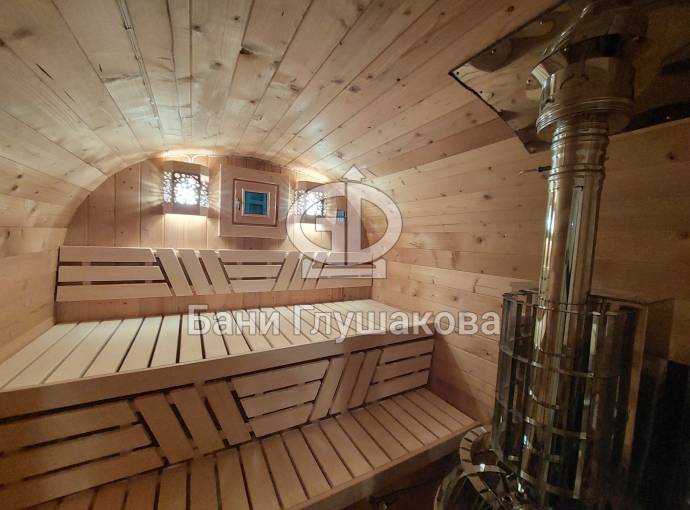 Это стандартный вариант на 2 помещения: предбанник и парная. В стоимость уже входит сборка, печь нашего производства с двумя каменками и парогенератором, электрика, металлические уличные светильники, ступеньки. Вокруг печи стоит металлический экран. Установлены металлические комплектующие из нержавейки: вентиляционные клапаны-задвижки, крепления для проводки, наличник на форточку и порожек между помещениями. Ступеньки тоже уже входят в стоимость.