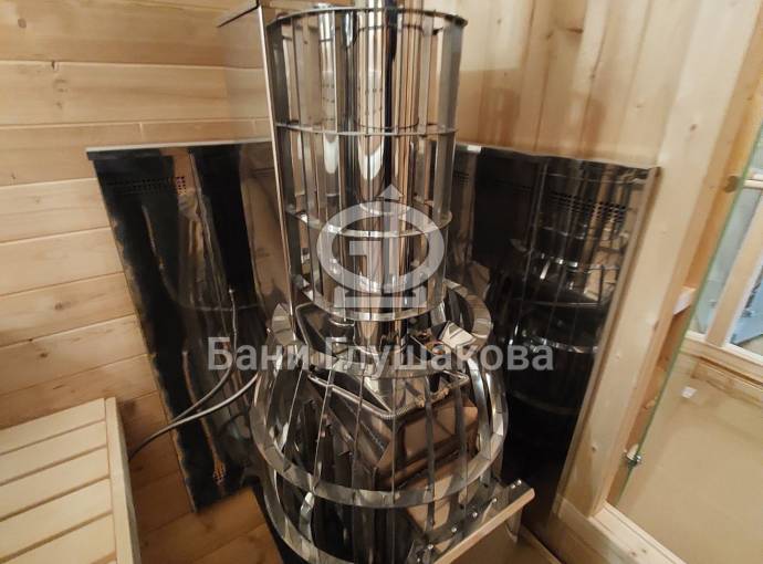 Это квадробочка размером 2,3 на 5,7 метров с окном и улучшенной планировкой. Вход располагается по центру и украшен аккуратной аркой-козырьком. Внутри есть предбанник, сауна и комната отдыха. Обратите внимание, что это модель не оснащена душевой системой — мыться в парной, там для этого всё подготовлено.