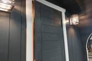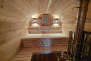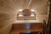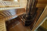 В стоимость уже входит сборка, печь нашего производства с двумя каменками и парогенератором, электрика, металлические уличные светильники, ступеньки. Вокруг печи стоит металлический экран. Установлены металлические комплектующие из нержавейки: вентиляционные клапаны-задвижки, крепления для проводки, наличник на форточку и порожек между помещениями. Ступеньки тоже уже входят в стоимость. Замечательная расстановка в парной: широкие полки поставлены углом, а печь сбоку. Поверьте нашему многолетнему опыту — это и правда самый удобный вариант.
