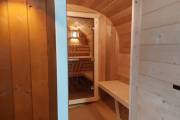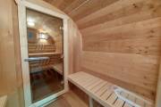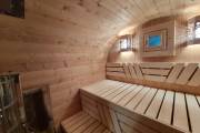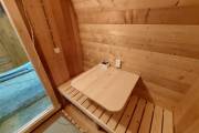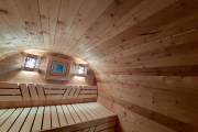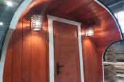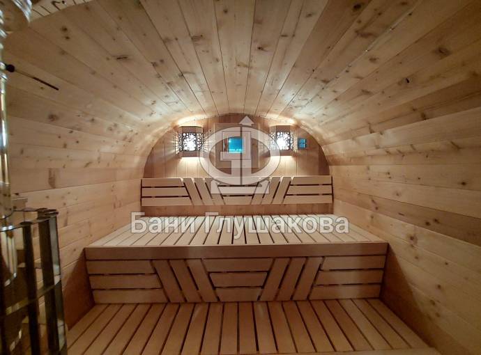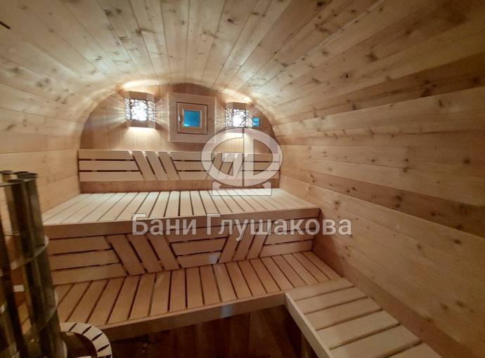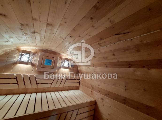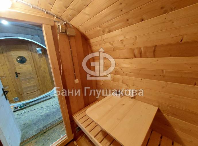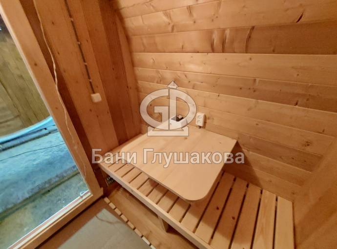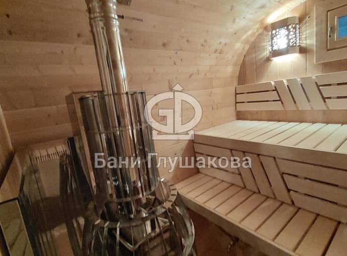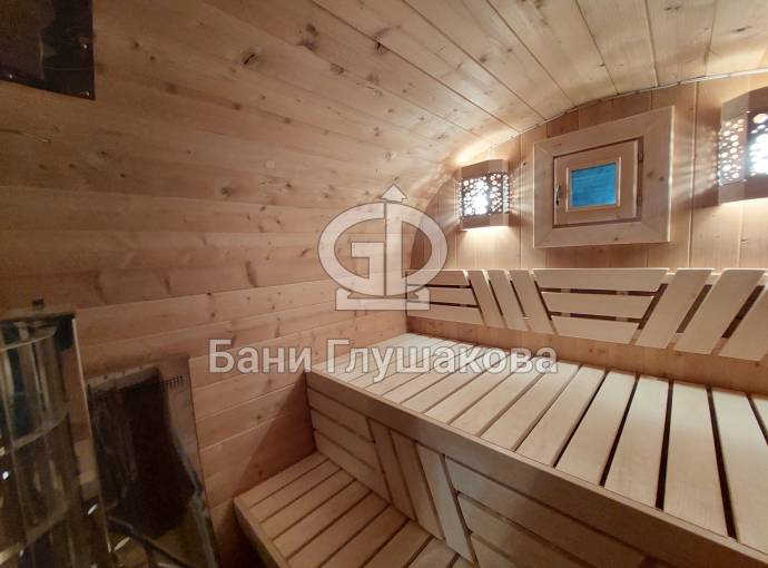 Баня сделана из высококачественной термомодифицированной древесины. Без изъянов. Поэтому её цена немного выше, чем у других бань, изготовленных на продажу.