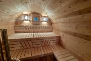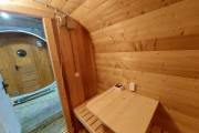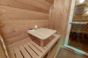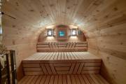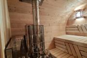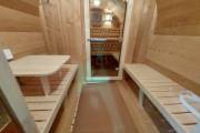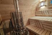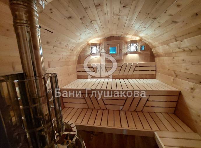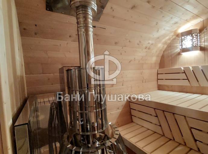 Это стандартный вариант на 2 помещения: предбанник и парная. В стоимость уже входит сборка, печь нашего производства с двумя каменками и парогенератором, электрика, металлические уличные светильники, ступеньки. Вокруг печи стоит металлический экран. Установлены металлические комплектующие из нержавейки: вентиляционные клапаны-задвижки, крепления для проводки, наличник на форточку и порожек между помещениями. Ступеньки тоже уже входят в стоимость.