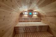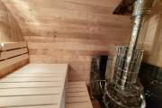 В стоимость уже входит сборка, печь нашего производства с двумя каменками и парогенератором, электрика, металлические уличные светильники, ступеньки. Вокруг печи стоит металлический экран. Установлены металлические комплектующие из нержавейки: вентиляционные клапаны-задвижки, крепления для проводки, наличник на форточку и порожек между помещениями. Ступеньки тоже уже входят в стоимость. Замечательная расстановка в парной: широкие полки поставлены углом, а печь сбоку. Поверьте нашему многолетнему опыту — это и правда самый удобный вариант.