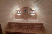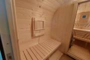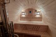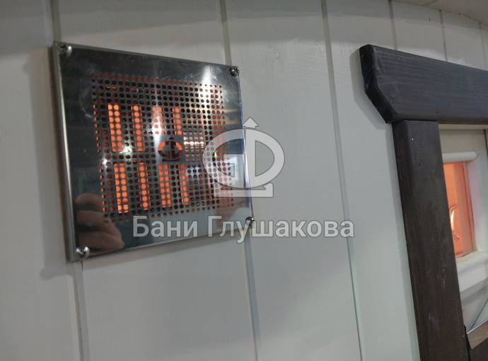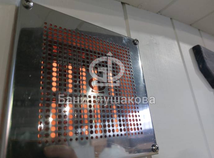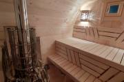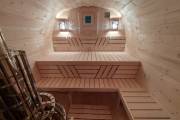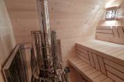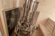 В стоимость уже входит сборка, печь нашего производства с двумя каменками и парогенератором, электрика, металлические уличные светильники, ступеньки. Вокруг печи стоит металлический экран. Установлены металлические комплектующие из нержавейки: вентиляционные клапаны-задвижки, крепления для проводки, наличник на форточку и порожек между помещениями. Ступеньки тоже уже входят в стоимость. Замечательная расстановка в парной: широкие полки поставлены углом, а печь сбоку. Поверьте нашему многолетнему опыту — это и правда самый удобный вариант.