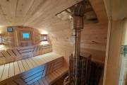В стоимость уже входит сборка, печь нашего производства с двумя каменками и парогенератором, электрика, металлические уличные светильники, ступеньки. Вокруг печи стоит металлический экран. Установлены металлические комплектующие из нержавейки: вентиляционные клапаны-задвижки, крепления для проводки, наличник на форточку и порожек между помещениями. Ступеньки тоже уже входят в стоимость. Замечательная расстановка в парной: широкие полки поставлены углом, а печь сбоку. Поверьте нашему многолетнему опыту — это и правда самый удобный вариант.