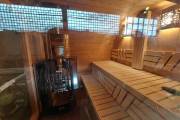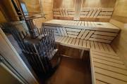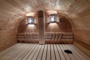 Замечательная расстановка в парной: широкие полки поставлены углом, а печь сбоку. Печь нашего производства обладает внутренней закрытой каменкой – оооочень мощная и даёт прекрасный пар. Также в парной сделана принудительная вентиляция «Димасту» и «Второе дыхание». Любители хорошо попариться точно оценят.