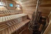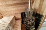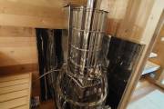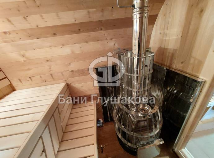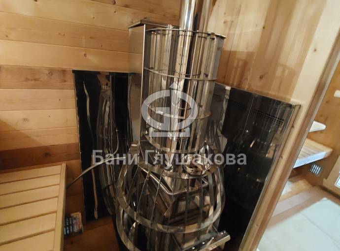 Это стандартный вариант на 2 помещения: предбанник и парная. В стоимость уже входит сборка, печь нашего производства с двумя каменками и парогенератором, электрика, металлические уличные светильники, ступеньки. Вокруг печи стоит металлический экран. Установлены металлические комплектующие из нержавейки: вентиляционные клапаны-задвижки, крепления для проводки, наличник на форточку и порожек между помещениями. Ступеньки тоже уже входят в стоимость.