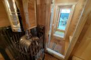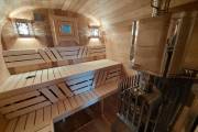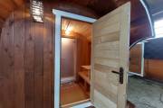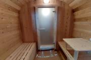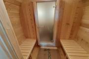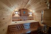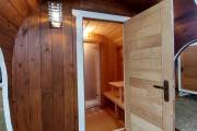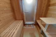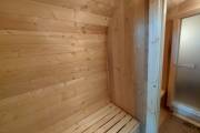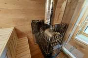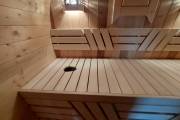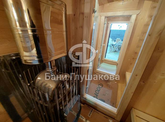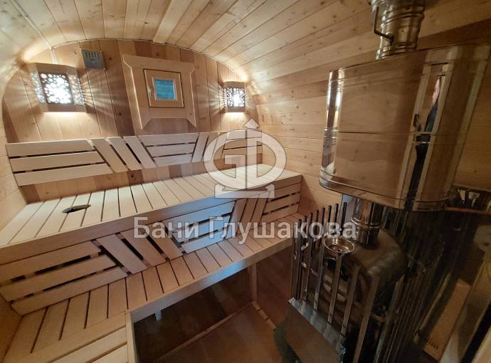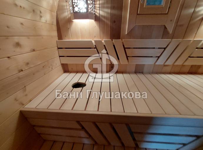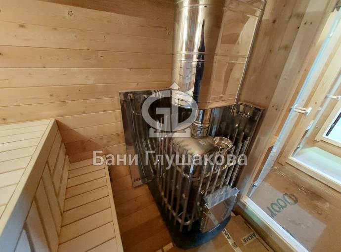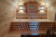 В стоимость уже входит сборка, печь нашего производства с двумя каменками и парогенератором, электрика, металлические уличные светильники, ступеньки. Вокруг печи стоит металлический экран. Установлены металлические комплектующие из нержавейки: вентиляционные клапаны-задвижки, крепления для проводки, наличник на форточку и порожек между помещениями. Ступеньки тоже уже входят в стоимость. Замечательная расстановка в парной: широкие полки поставлены углом, а печь сбоку. Поверьте нашему многолетнему опыту — это и правда самый удобный вариант.