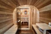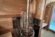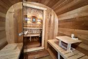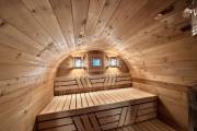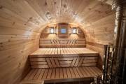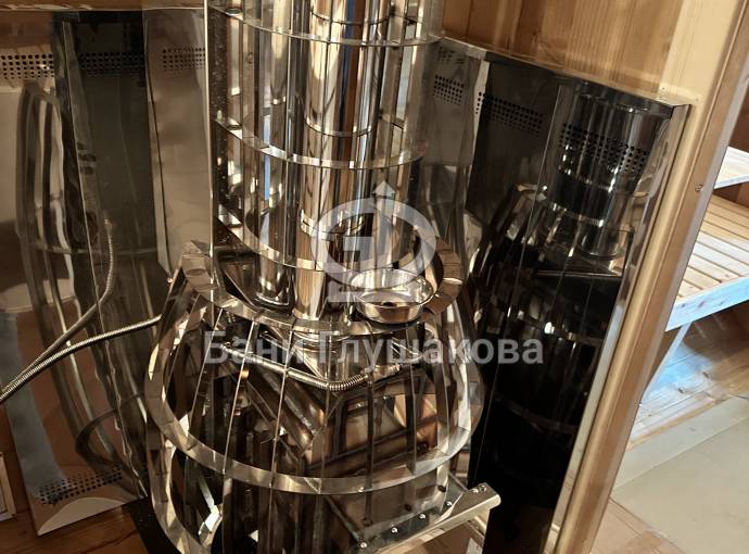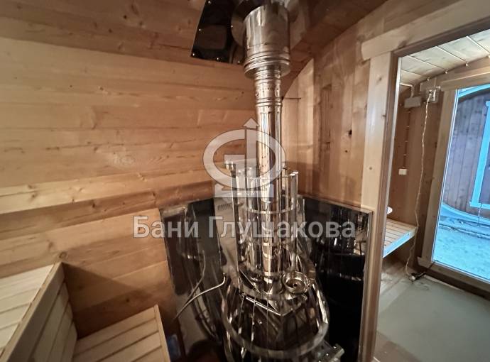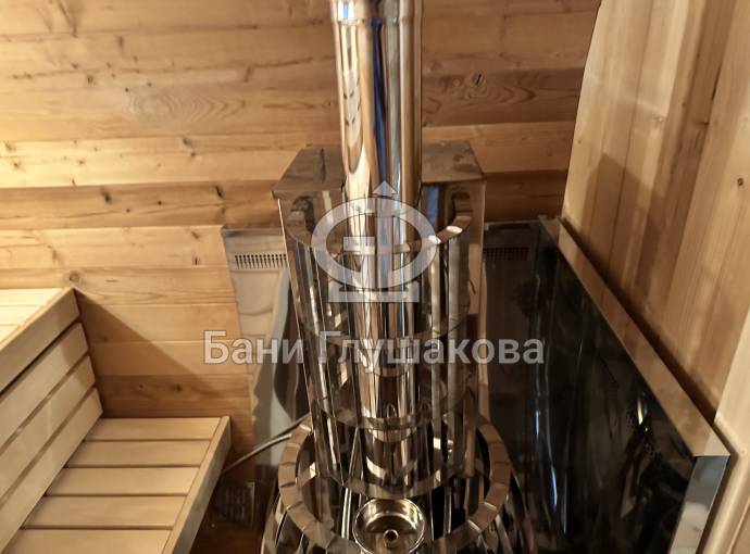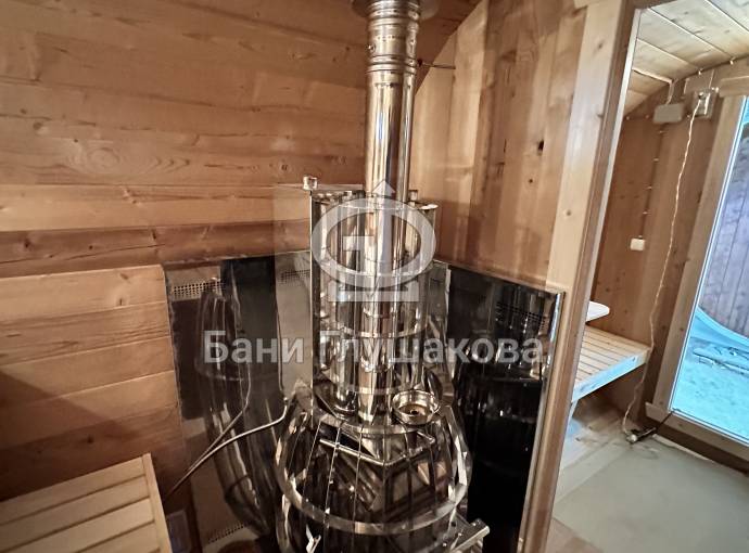 В стоимость уже входит сборка, печь нашего производства с двумя каменками и парогенератором, электрика, металлические уличные светильники, ступеньки. Вокруг печи стоит металлический экран. Установлены металлические комплектующие из нержавейки: вентиляционные клапаны-задвижки, крепления для проводки, наличник на форточку и порожек между помещениями. Ступеньки тоже уже входят в стоимость. Замечательная расстановка в парной: широкие полки поставлены углом, а печь сбоку. Поверьте нашему многолетнему опыту — это и правда самый удобный вариант.