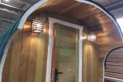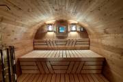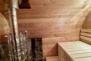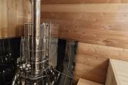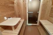 Установлены металлические комплектующие из нержавейки: вентиляционные клапаны-задвижки, крепления для проводки, наличник на форточку и порожек между помещениями. Ступеньки тоже уже входят в стоимость. Замечательная расстановка в парной: широкие полки поставлены углом, а печь сбоку. Поверьте нашему многолетнему опыту — это и правда самый удобный вариант.