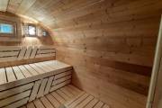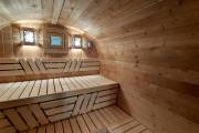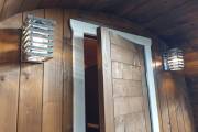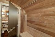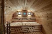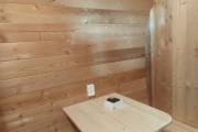 Установлены металлические комплектующие из нержавейки: вентиляционные клапаны-задвижки, крепления для проводки, наличник на форточку и порожек между помещениями. Ступеньки тоже уже входят в стоимость. Замечательная расстановка в парной: широкие полки поставлены углом, а печь сбоку. Поверьте нашему многолетнему опыту — это и правда самый удобный вариант.