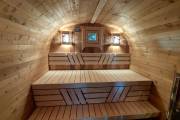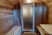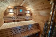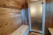Установлены металлические комплектующие из нержавейки: вентиляционные клапаны-задвижки, крепления для проводки, наличник на форточку и порожек между помещениями. Ступеньки тоже уже входят в стоимость. Замечательная расстановка в парной: широкие полки поставлены углом, а печь сбоку. Поверьте нашему многолетнему опыту — это и правда самый удобный вариант.