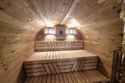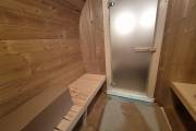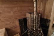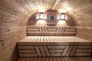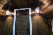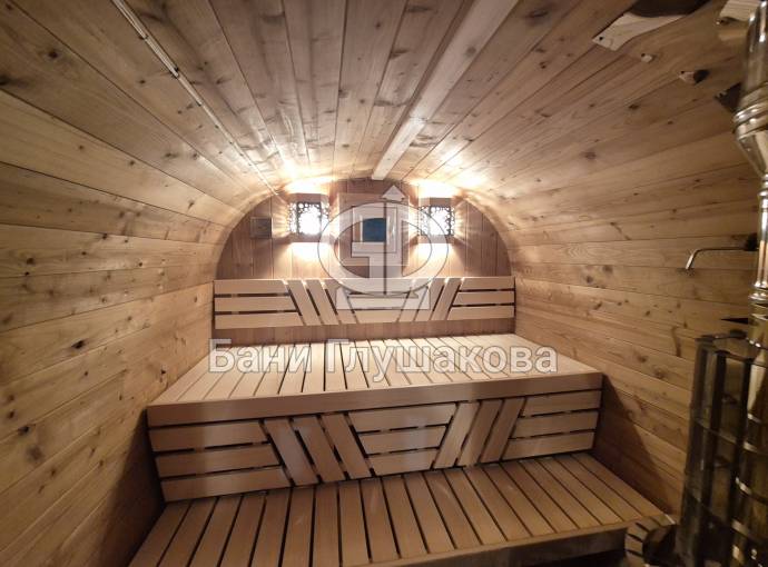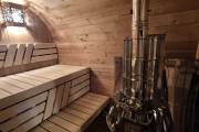 В стоимость уже входит сборка, печь нашего производства с двумя каменками и парогенератором, электрика, металлические уличные светильники, ступеньки. Вокруг печи стоит металлический экран. Установлены металлические комплектующие из нержавейки: вентиляционные клапаны-задвижки, крепления для проводки, наличник на форточку и порожек между помещениями. Ступеньки тоже уже входят в стоимость. Замечательная расстановка в парной: широкие полки поставлены углом, а печь сбоку. Поверьте нашему многолетнему опыту — это и правда самый удобный вариант.