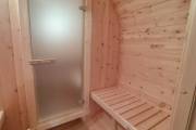 Можно установить насосную станцию, бойлер, бак, душ, устанавливается как в душевой комнате так и в маленькой бане, но уже слева или с права в комнате отдыха, а душ выводится в этом случае в парную.