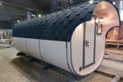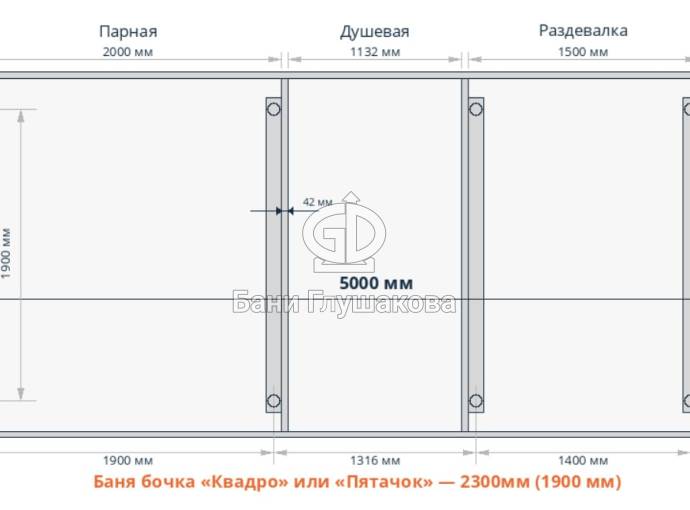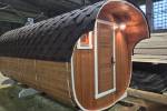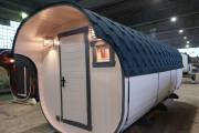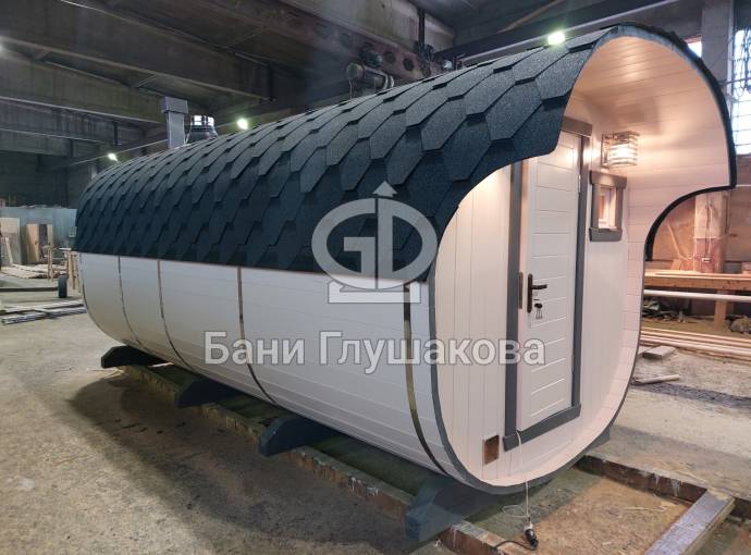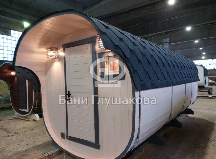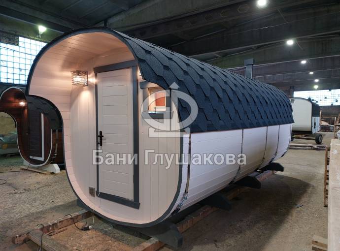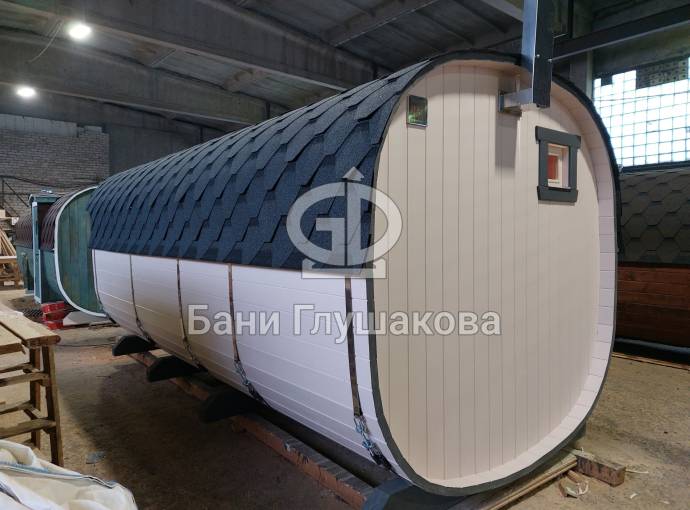 Базовая модель квадратной бани бочки увеличенного диаметра 2,3 на 5 метра плюс козырёк 50 см.