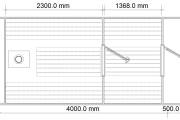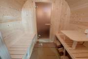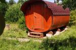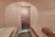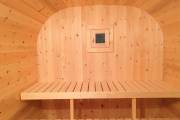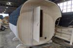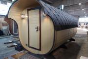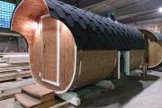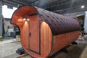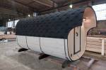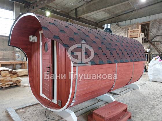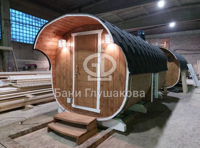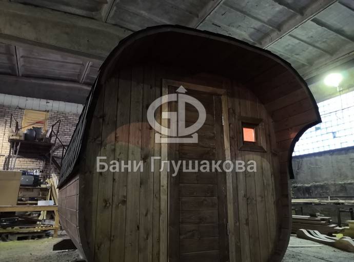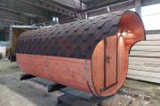 Базовая модель квадратной бани бочки стандартного размера 2,1 на 4 метра плюс козырёк. Иногда просят увеличить ширину до 2,2-2,4 метров — без проблем, но с доплатой за материал. Внутри 2 помещения: предбанник и парная.
