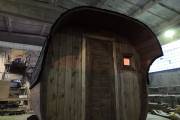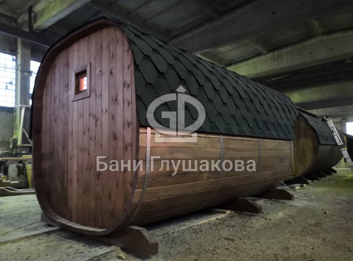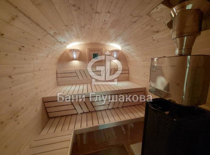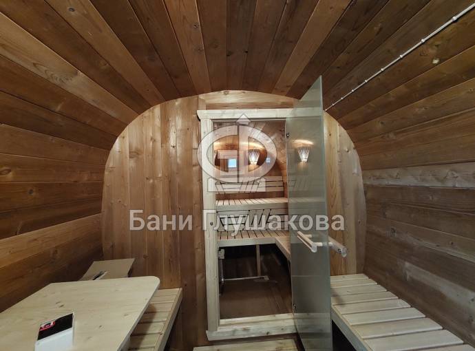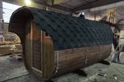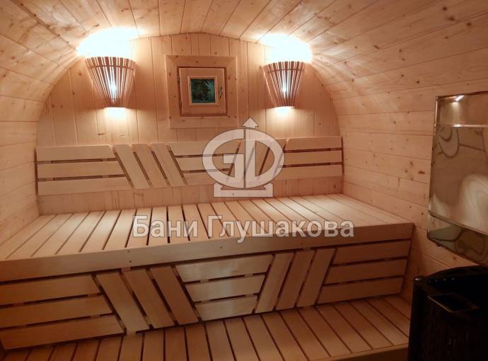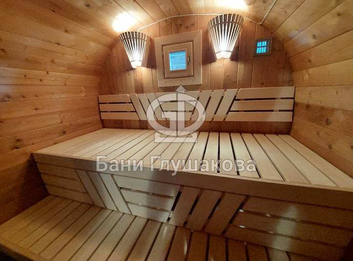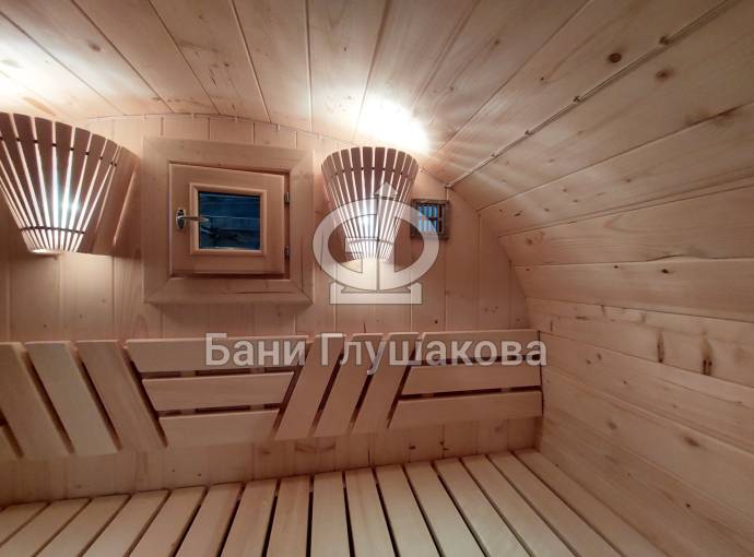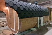 Баня изготавливается из бочковой доски 42 мм (по сути — брус с лунным пазом). Материал может быть из термомодифицированной древесины, кедра или ёлки. Разница в свойствах и цене.