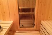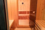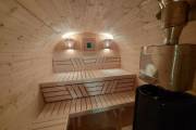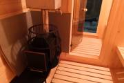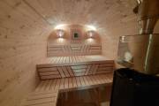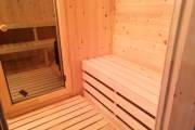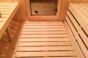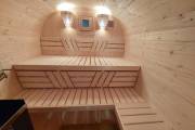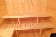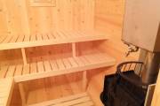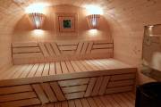 Предбанник или комната отдыха оснащён двумя скамеечками, столиком, розетками, трапиком и светильником. В парной ставим двухуровневый полок, печь с двумя каменками и парогенератором, форточку, вешаем красивые светильники и делаем подсветку нижнего яруса полка.