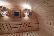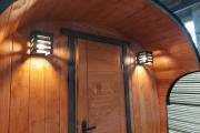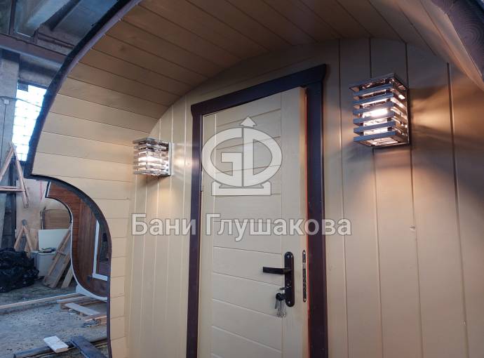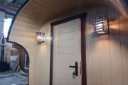 Можно установить один или более светильник у входной двери бани бочки снаружи, подробнее по ссылке, в комплект входит покраска его в цвет окантовки бани, подключение на отдельный выключатель, светодиодная лампа. Стоимость 1700 рублей за штуку