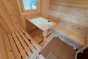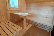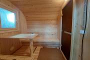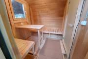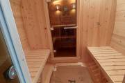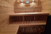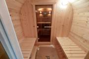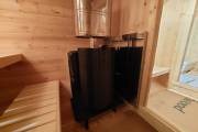 В парной установлены широкие двухуровневые полки — тут с комфортом разместится даже крупный высокий мужчина. Печь установлена сбоку, топка выведена на улицу.