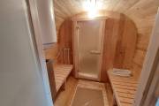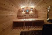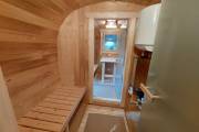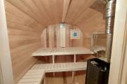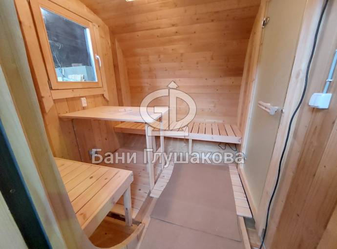 Баня-бочка квадратного типа стандартного размера 2,2 на 5,9 метров разделена на 3 помещения: помывочную, комнату отдыха и парную. Площадь позволяет установить душевую систему.