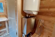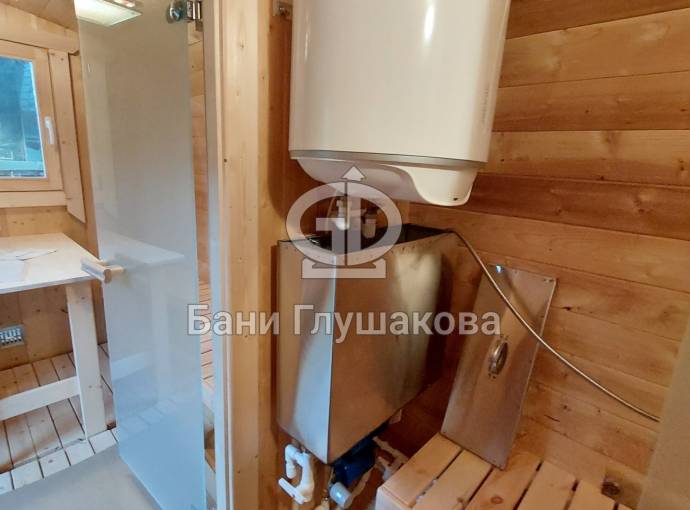Можно установить насосную станцию, бойлер, бак, душ, устанавливается как в душевой комнате так и в маленькой бане, но уже слева или с права в комнате отдыха, а душ выводится в этом случае в парную.