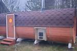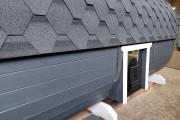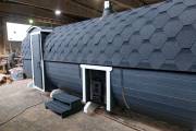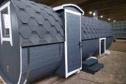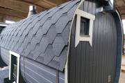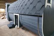 Такую баню можно построить из елки, кедра или термомодифицированной древесины. На фото мы демонстрируем 2 бани: синяя из термомодифицированной доски, коричневая – из обычной еловой бочковой доски.